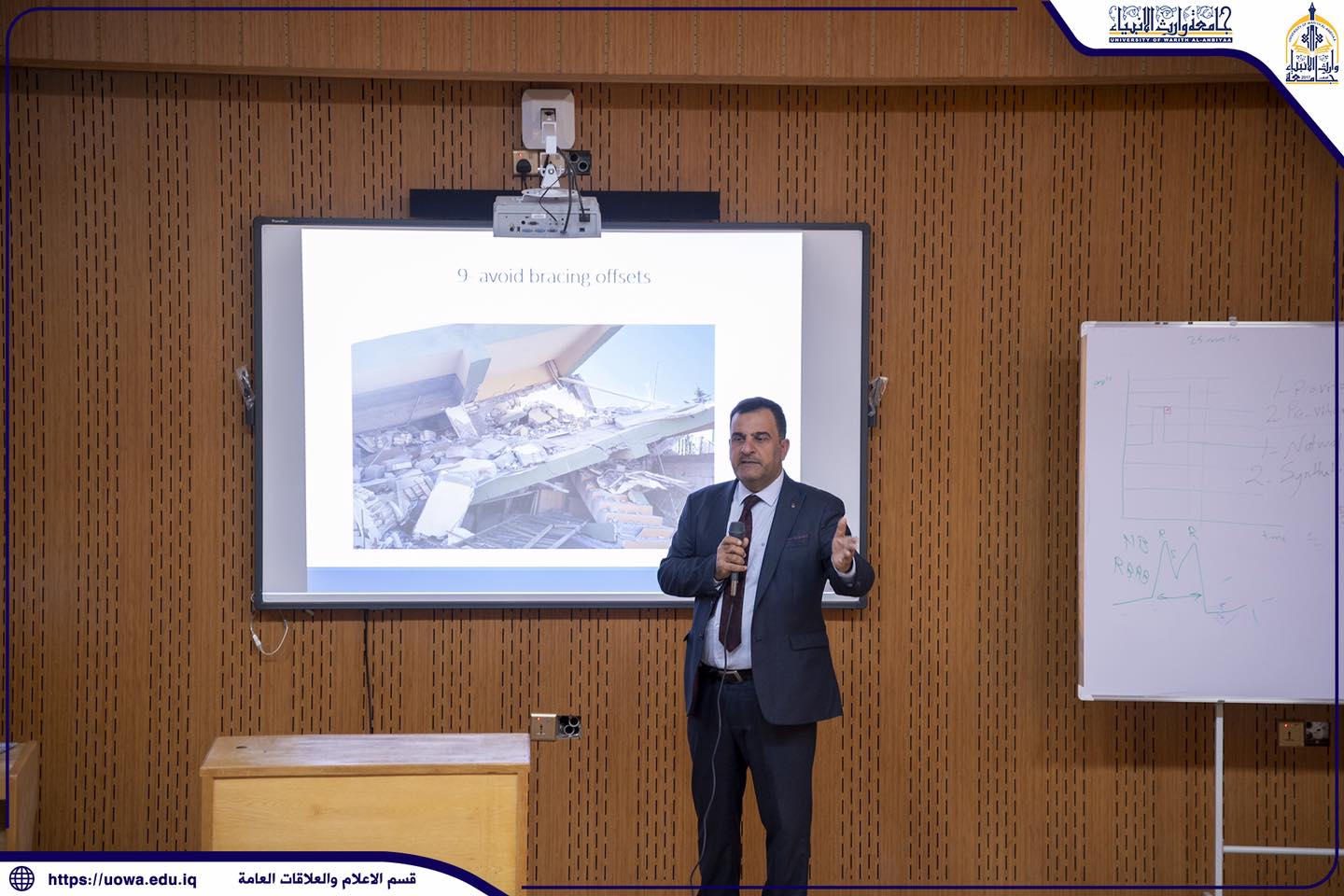 اقام قسم الهندسة المدنية وبالتعاون مع قسم المشاريع الهندسية في العتبة الحسينية المقدسة ندوة علمية بعنوان ( مبادئ توجيهية لتصميم مقاوم للزلازل وتفاصيل الهياكل الخرسانية المسلحة وفقاً لمدونة البناء ACI19- 318) ألقاها الاستاذ الدكتور هيثم حسن الدعمي اذ تأتي هذه الندوة ضمن نشاطات المدونة الامريكية للخرسانة المسلحة - فرع العراق