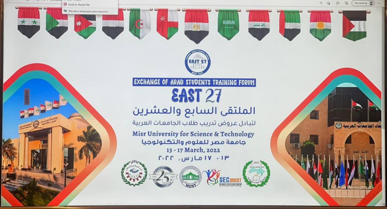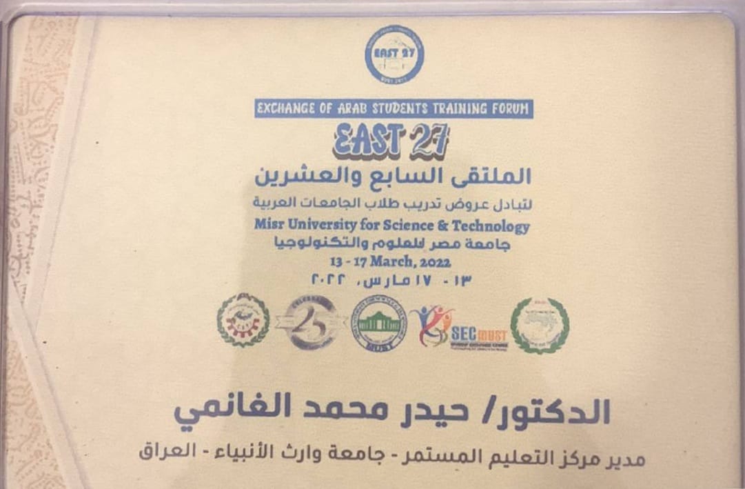 شارك السيد مدير مركز التعليم المستمر في الجامعة الدكتور حيدر الغانمي في" الملتقى السابع والعشرين لتبادل عروض تدريب طلبة الجامعات العربية" الذي يقيمه اتحاد الجامعات العربية، ونظمته جامعة مصر للعلوم و التكنلوجيا بمشاركة36 جامعة من 13 دوله عربية.