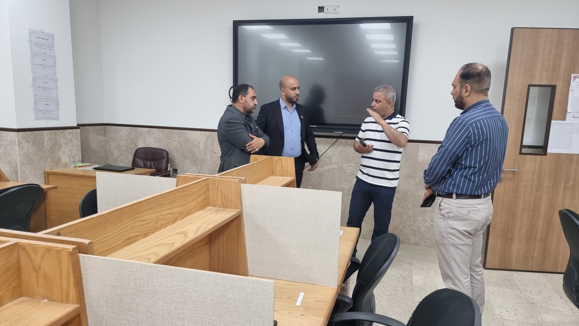 حيث ابدى الوفد اعجابه بماتمتلكه الجامعة من امكانيات حديثة وسعات كبيرة ونظام الكتروني متكامل لاداء الامتحان التقويمي.