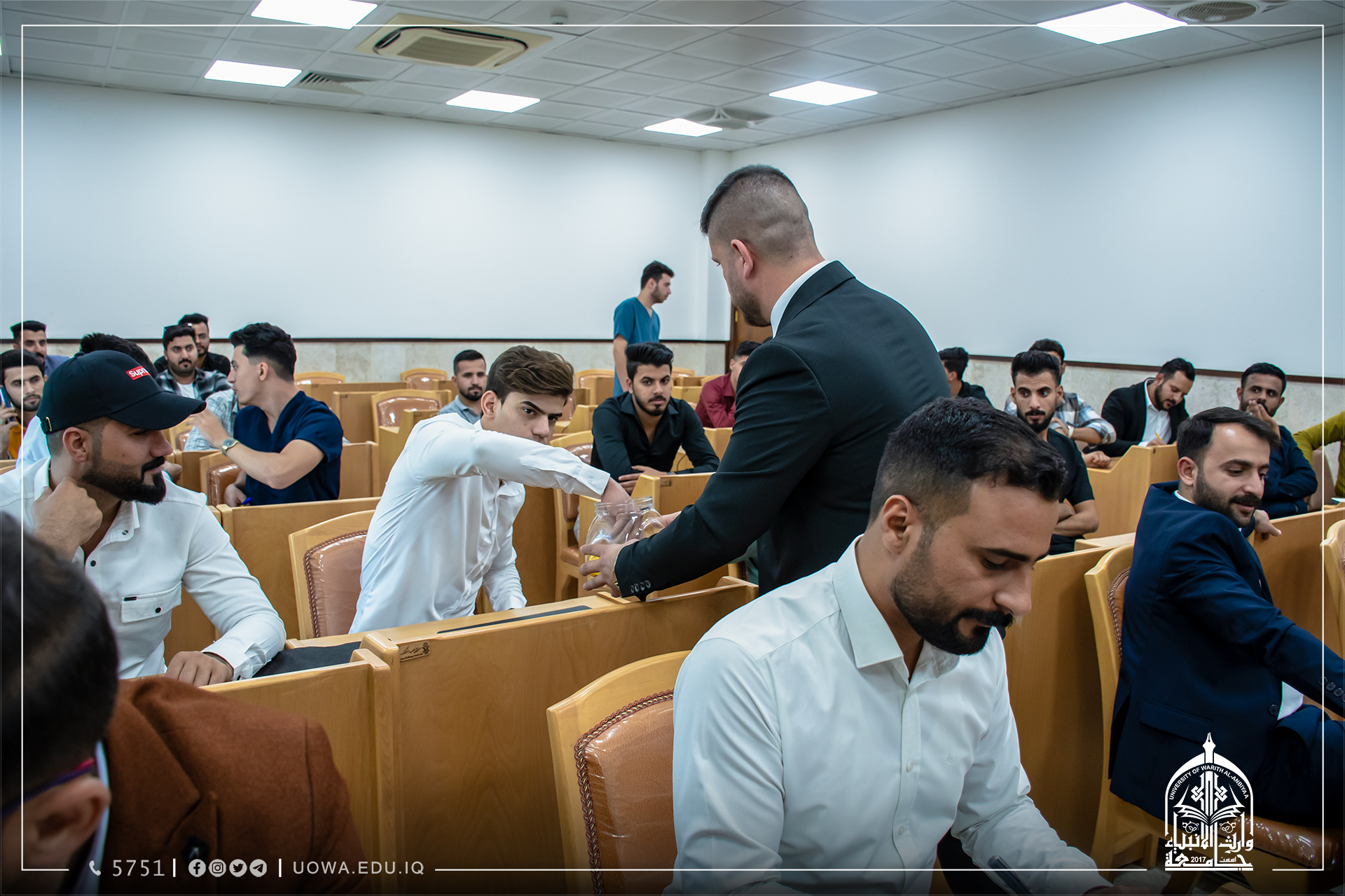 اقام قسم النشاطات الطلابية في جامعة وارث الانبياء(عليه السلام) اجتماعه الفني مع أعضاء لجان النشاطات الطلابية في الكليات وممثلي الطلبة المشاركين في البطولة في كليات واقسام الجامعة لاجراء قرعة بطولة وارث الانبياء السنوية لخماسي كرة القدم.