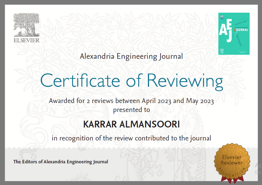 أختير التدريسي في قسم هندسة تقنيات التكييف والتبريد (م.م. كرار المنصوري) مقوماً علمياً في المجلة العالمية (Alexandria Engineering Journal ) والمفهرسة ضمن الصنف الاول (Q1) في مستوعبات Scopus و Clarivate والتي تمتلك Cite score 8.3 و6.626 Impact Factor والصادرة عن دار النشر ال ELSEVIER والتي تعتبر من أقدم واكبر دور النشر واشهرها .والتي تحمل الرقم المعياري EISSN: 1110-0168 حيث تختص هذه المجلة بنشر البحوث العلمية في مختلف المجالات الهندسية.