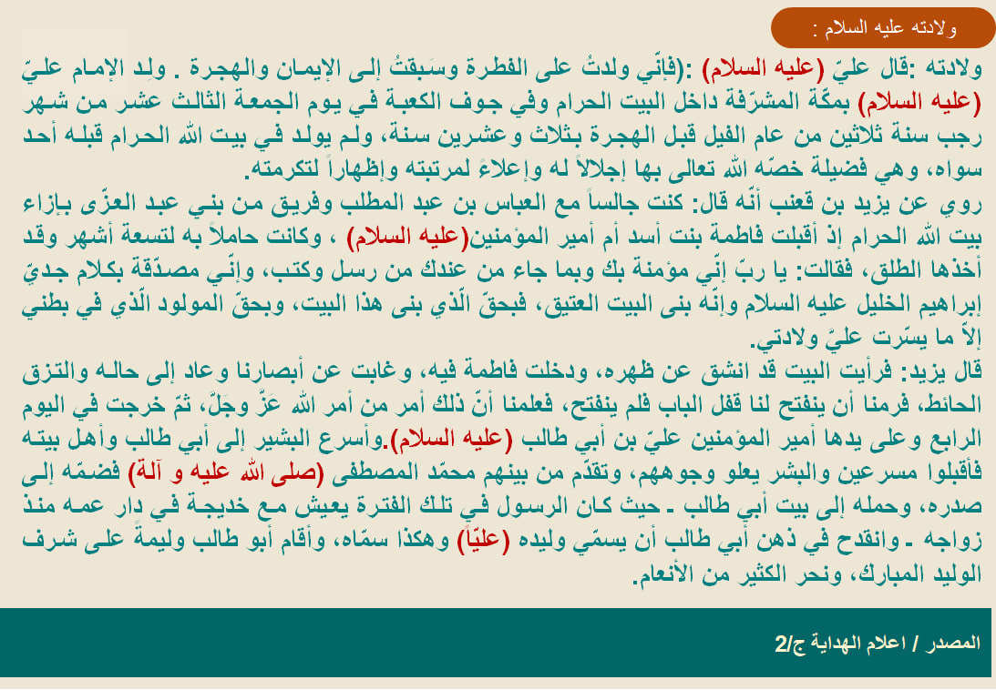 ولادته :قال عليّ (عليه السلام) :(فإنّي ولدتُ على الفطرة وسَبقتُ إلى الإيمان والهجرة . ولِد الإمام عليّ (عليه السلام) بمكّة المشرّفة داخل البيت الحرام وفي جوف الكعبة في يوم الجمعة الثالث عشر من شهر رجب سنة ثلاثين من عام الفيل قبل الهجرة بثلاث وعشرين سنة، ولم يولد في بيت الله الحرام قبله أحد سواه، وهي فضيلة خصّه الله تعالى بها إجلالاً له وإعلاءً لمرتبته وإظهاراً لتكرمته.