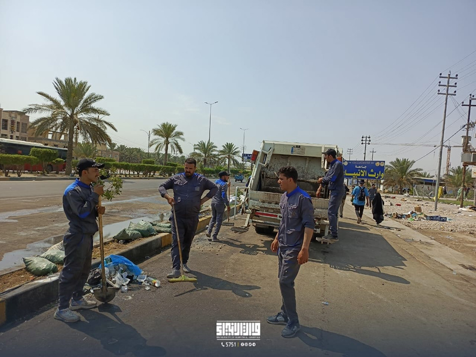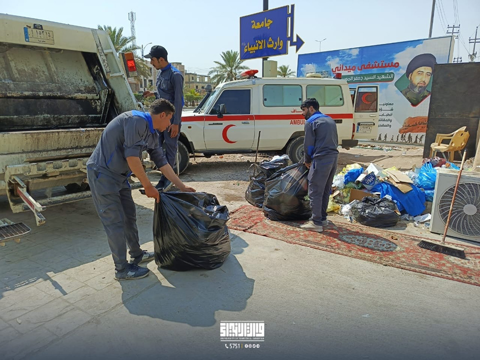 باشر أبطال قسم شؤون الديوان في جامعة وارث الأنبياء (عليه السلام) بحملة تنظيف واسعة للواجهة الأمامية للجامعة وطريق (يا حسين)، بالتعاون مع قسم رعاية الحرم في العتبة الحسينية المقدسة وكوادره المتخصصة.