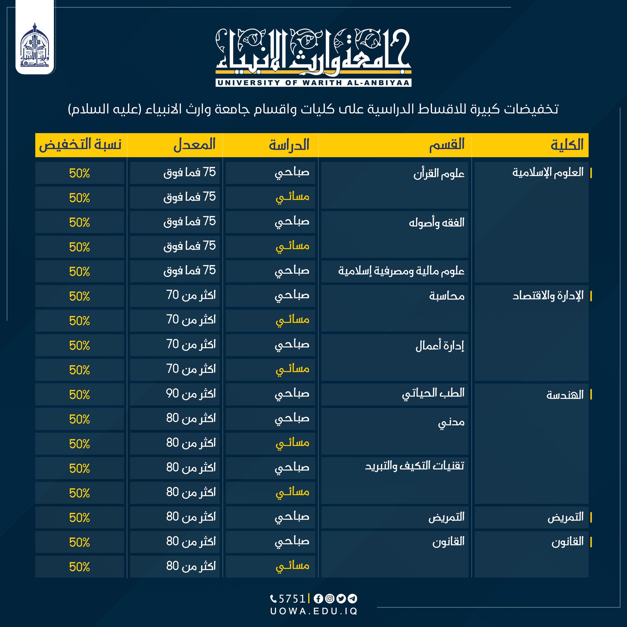 مراعاة للظروف التي يمر بها الطلبة تعلن رئاسة جامعة وارث الانبياء(عليه السلام) عن تخفيض اجور بعض كليات الجامعة علماً أن الجامعة سبق وان اجرت تخفيضات كبيرة لاصحاب المعدلات العالية.