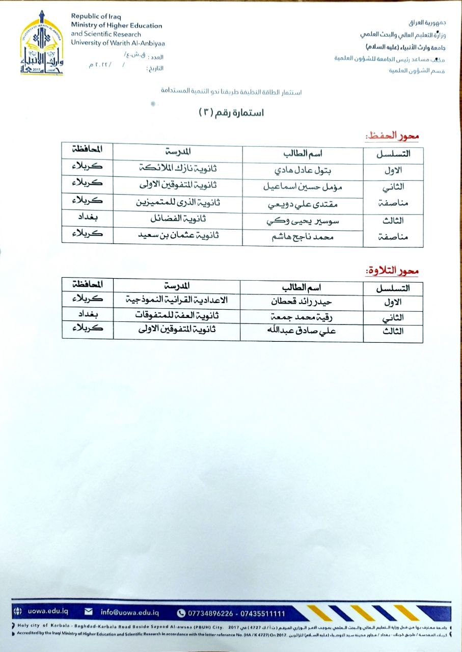 الى طلبة (المدارس الثانوية) المشتركين في مسابقة وارث الأنبياء للموهوبين والمبدعين