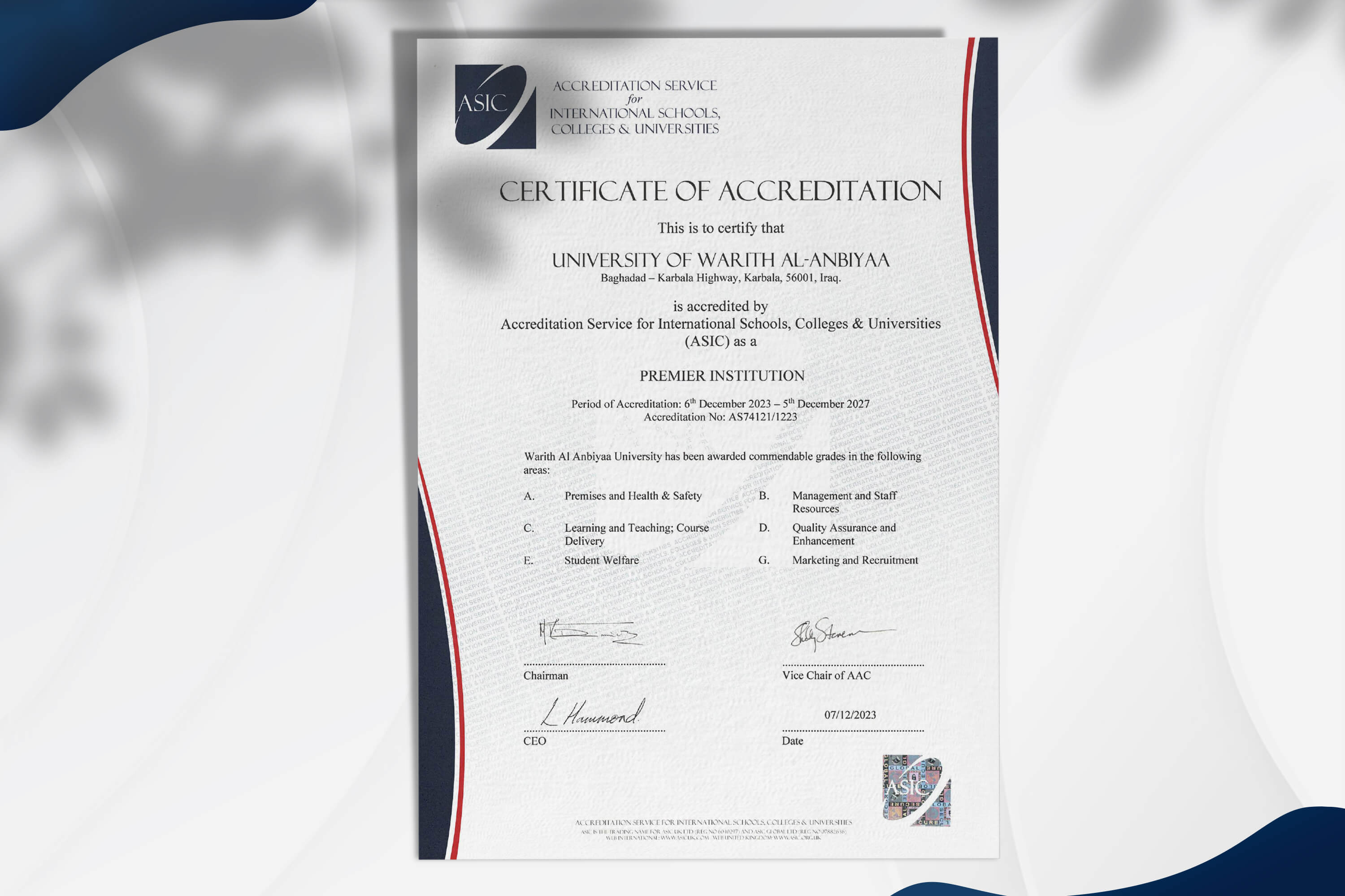جامعة وارث الأنبياء حاصلة على الاعتماد المؤسسي الدولي من ASIC بدرجة امتياز. يعتبر الاعتماد المؤسسي ASIC معيار جودة رائد ومعترف به عالمياً في قطاع التعليم العالي الدولي، حيث تخضع المؤسسات المعتمدة لعملية تقييم خارجي محايد ومستقل للتأكد من ان ادائها يتوافق مع المعايير الدولية الصارمة للاعتماد، والذي يشمل كامل نطاق إدارتها، وحوكمتها، وادائها التعليمي، إن تحقيق الاعتماد المؤسسي الدولي ASIC يظهر للطلاب وأصحاب المصلحة أن الجامعة هي مؤسسة تعليمية عالية الجودة ذات بيئة تعليمية متميزة تلتزم بالتحسين المستمر في عملياتها العلمية والادارية.