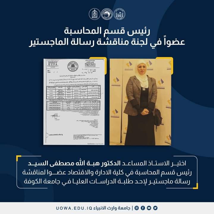 اختير الأستاذ المساعد الدكتور هبةالله مصطفى السيد رئيس قسم المحاسبة في كلية الادارة والاقتصاد عضوا لمناقشة رسالة ماجستير لاحد طلبة الدراسات العليا في جامعة الكوفة /كلية الادارة والاقتصاد. يذكر ان العديد من السادة التدريسيين والعمداء في جامعة وارث الانبياء(عليه السلام) يتم اختيارهم كرئيس او عضو في لجان مناقشة اطروحات الدراسات العليا لكفائتهم العلمية.