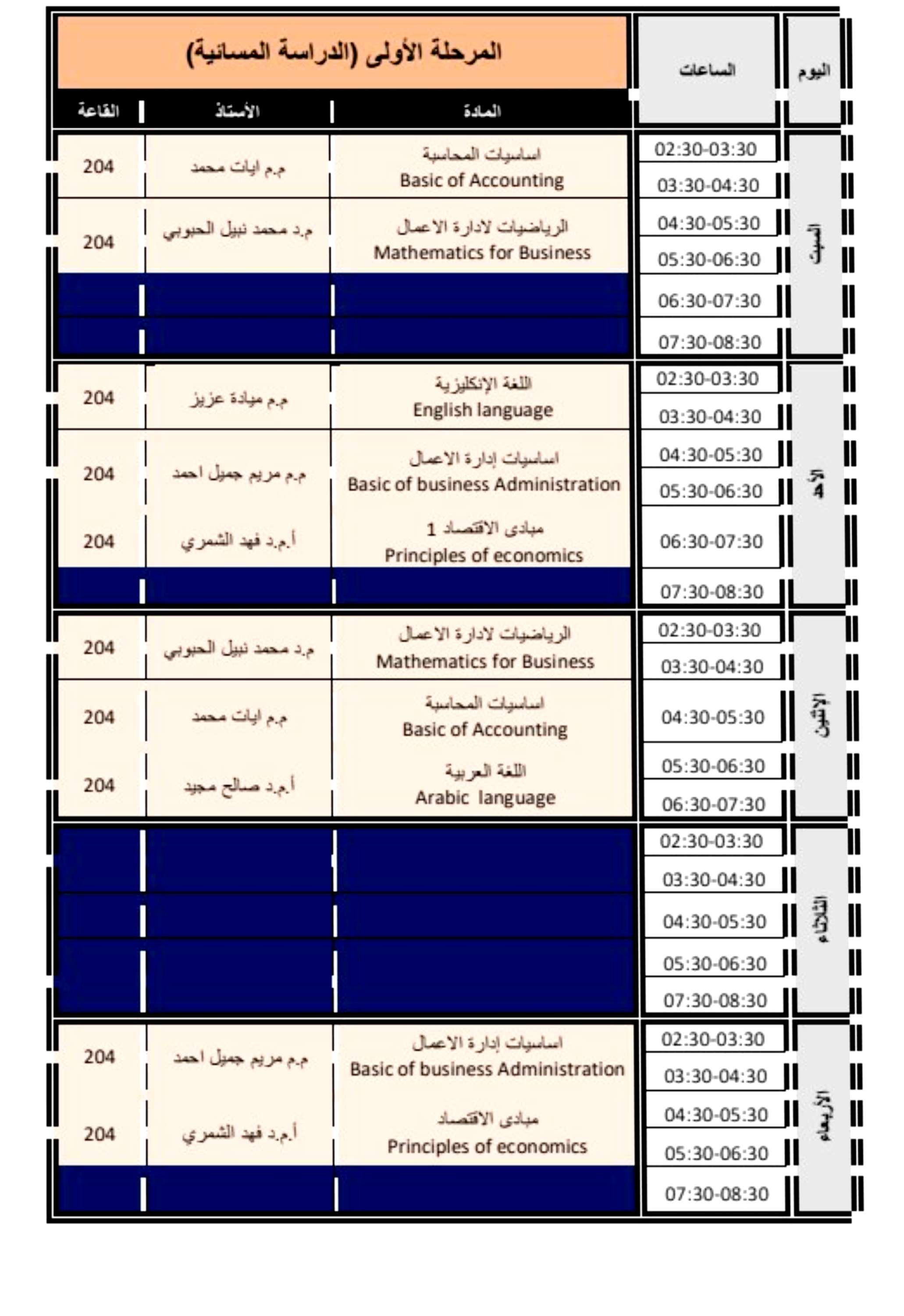 08:30-09:30: أساسيات إدارة الأعمال – م.م مريم جميل أحمد