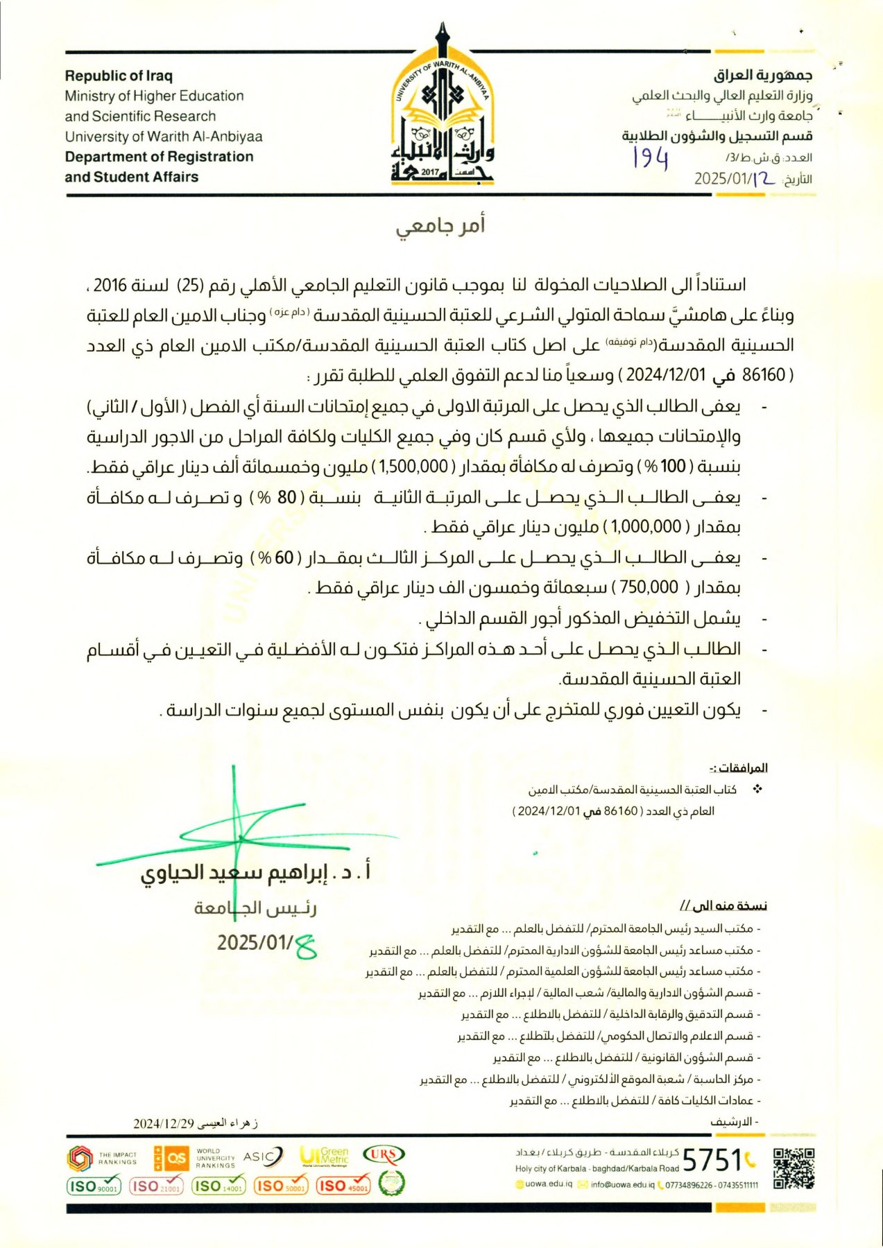 يعفى الطالب الذي يحصل على المرتبة الأولى في جميع امتحانات السنة أي الفصل ( الأول / الثاني) والإمتحانات جميعها ، ولأي قسم كان وفي جميع الكليات ولكافة المراحل من الاجور الدراسية بنسبة ( 100 ) وتصرف له مكافأة بمقدار ( 1,500,000) مليون وخمسمائة ألف دينار عراقي فقط.