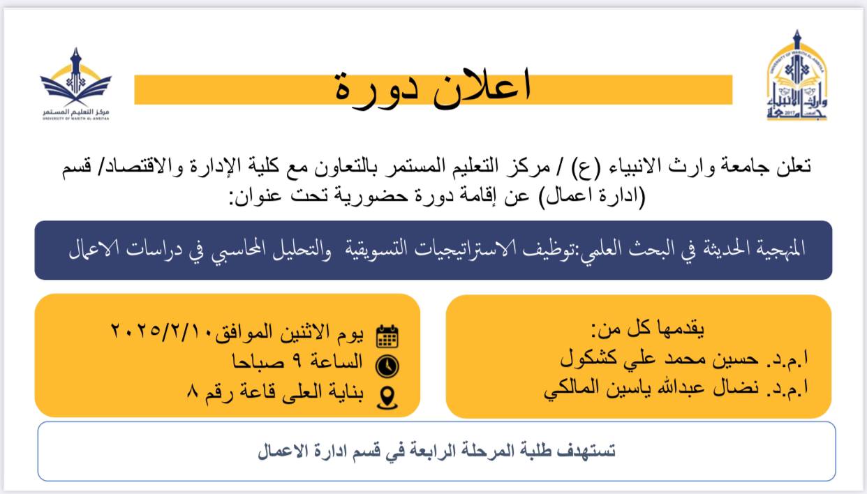 تقيم كلية الادارة والاقتصاد في جامعة وارث الانبياء (عليه السلام) قسم ادارة اعمال دورة مدتها ثلاثة ايام حول "المنهجية الحديثة في البحث العلمي : توظيف الاستراتيجيات التسويقية والتحليل المحاسبي في دراسات الاعمال" يقدمها كلا من الاستاذ المساعد الدكتور حسين محمد علي كشكول والاستاذة المساعدة الدكتورة نضال عبد الله ياسين المالكي