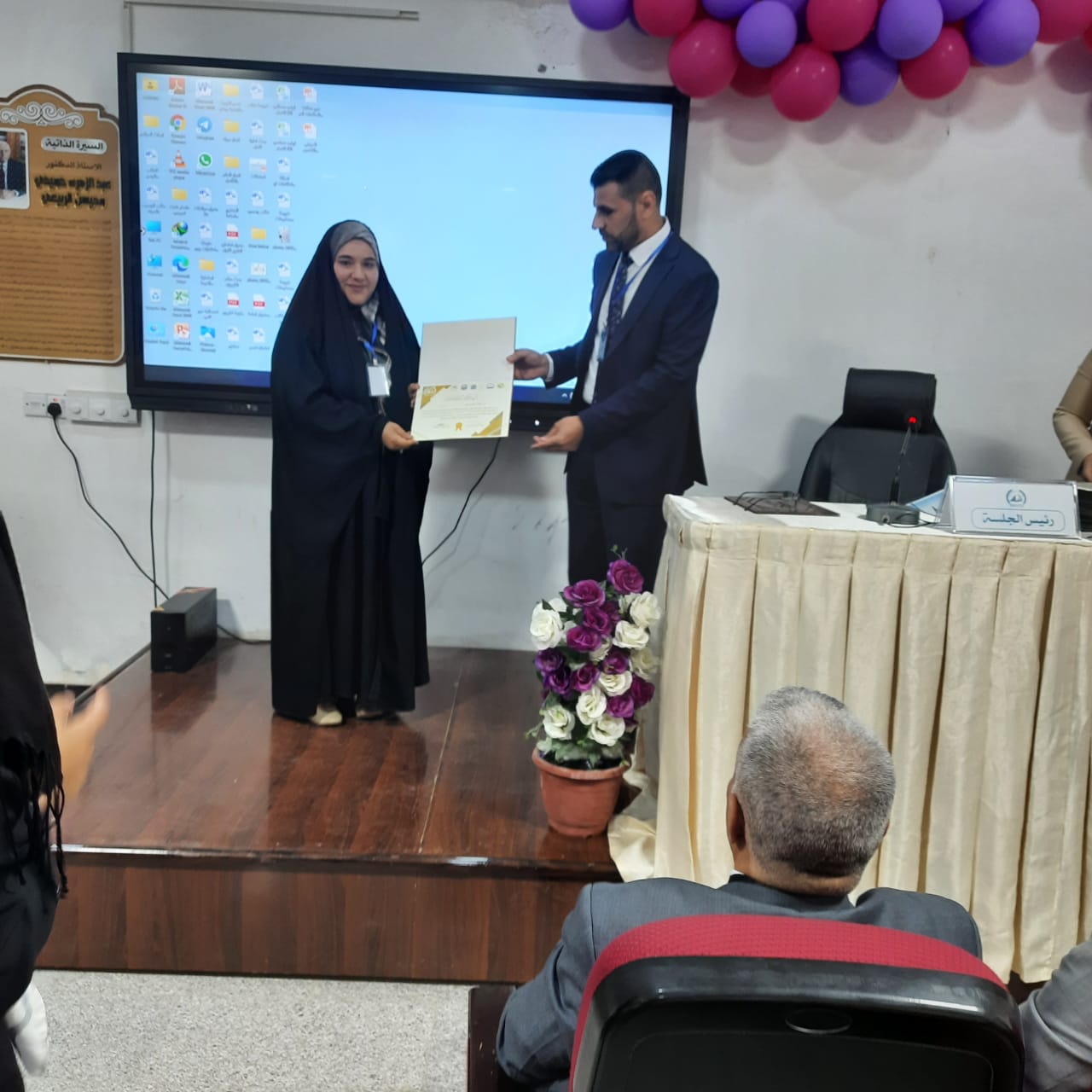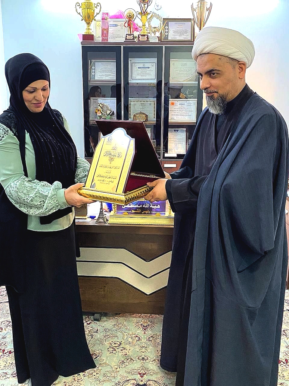 2022/04/26تقديرا للجهود المبذولة تم تكريم السيدة رئيس قسم المحاسبة (م.د هبة الله مصطفى السيد) بصفتها عضوا ومقررا في اللجنة العلمية بدرع السلم المجتمعي من قبل السيد رئيس اللجنة التحضيرية الشيخ؛ (علي القرعاوي) في المؤتمر الذي اقيم في العتبة الحسينية المقدسة الموسوم (المؤتمر الوطني الاول للحد من التطرف والارهاب).