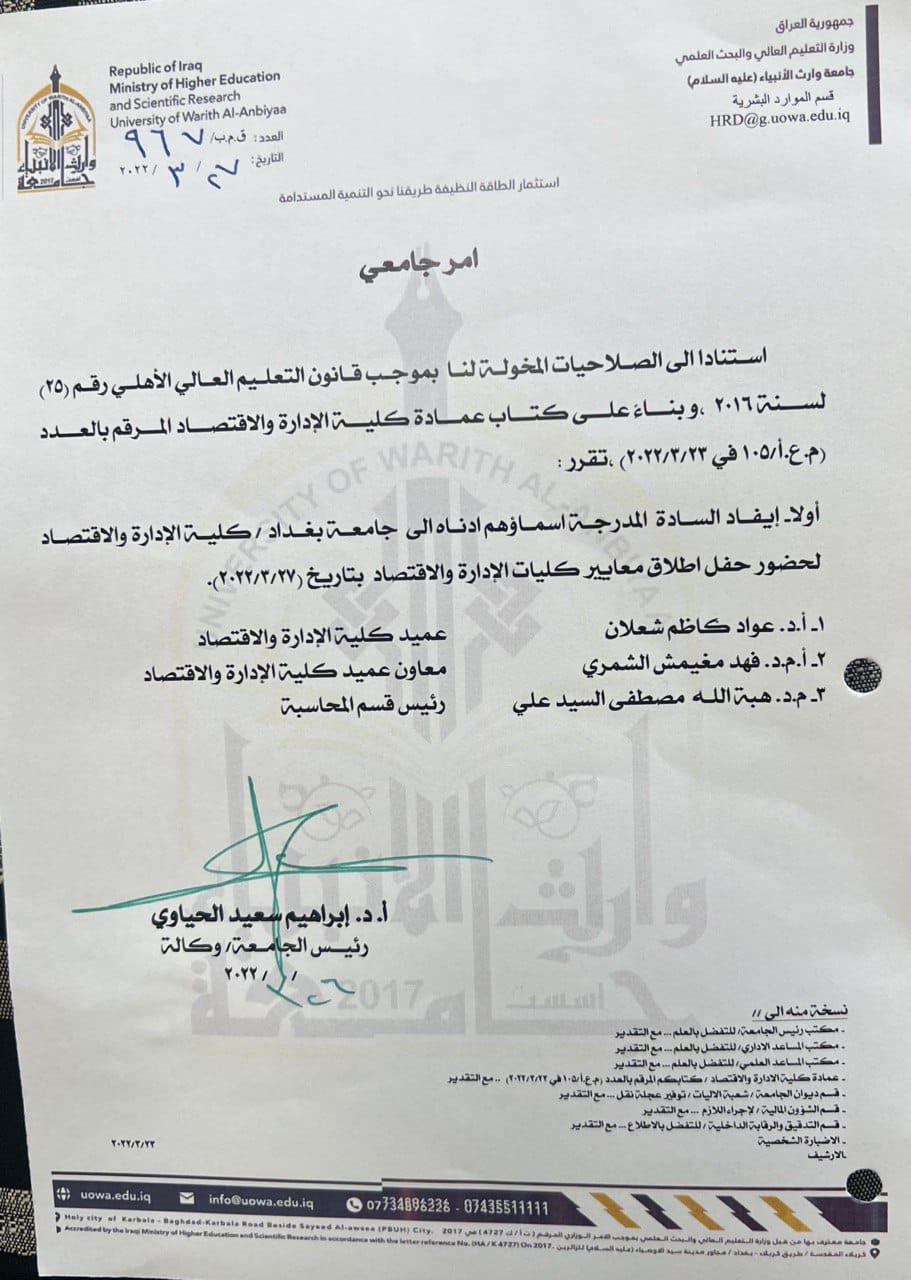 2022/03/29بفضل الله تم إطلاق اطلاق المعايير البرامجيه الوطنيه لكليات الادارة والاقتصاد في يوم ٢٨ / ٣ /٢٠٢٢ وبحضور كليات الادارة والاقتصاد الحكوميه والأهلية .اذ تم دعوة كل من الاستاذ الدكتور عواد الخالدي عميد كلية الادارة والاقتصاد ألاستاذ المساعد الدكتور فهد الشمريوالمدرس الدكتورة هبة الله مصطفى