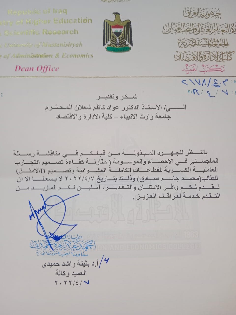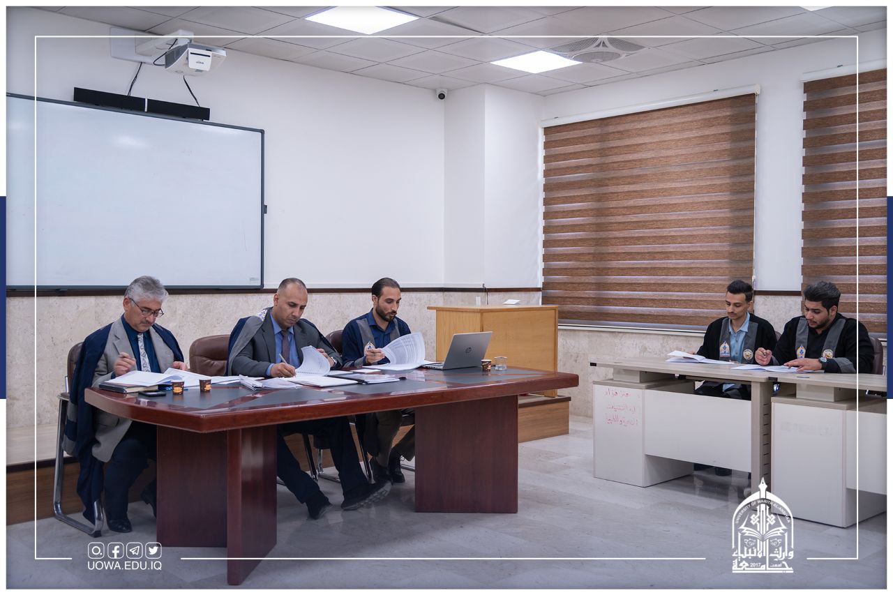 2022/04/20ترأس الاستاذ الدكتور عواد الخالدي عميدكليه الادارة والاقتصاد /جامعة وارث الأنبياء لجنة مناقشة علميه في قسم الاحصاء بالجامعة المستنصريه للطالب (محمد جاسم صادق)عن بحثه الموسوم (مقارنه كفاءة تصميم التجارب العاملية الكسرية للقطاعات الكاملة العشوائية وتصميم - 1 الامثل-) وذلك في يوم الخميس الموافق ٧/٤/٢٠٢٢ .