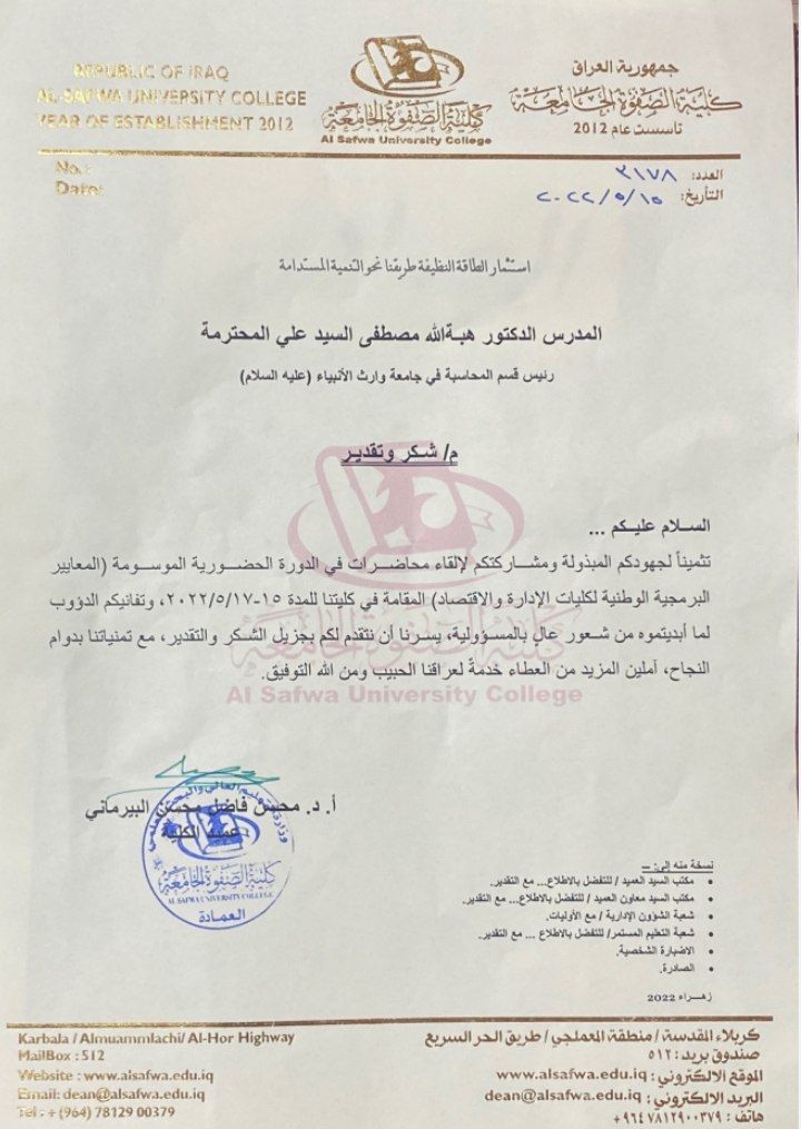 بالتعاون مع جامعة وارث الانبياء اقامت شعبة التعليم المستمر وقسم ضمان الجودة في كلية الصفوة الجامعة دورة تدريبية حضورية بعنوان " المعايير الوطنية البرمجية للحصول على الاعتمادية"