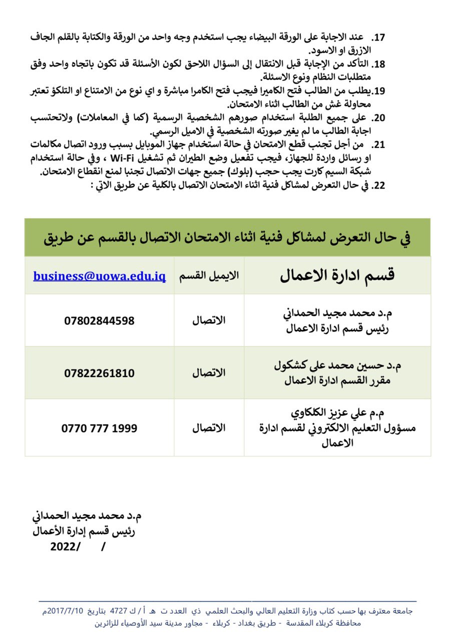 جدول الامتحانات الحضورية والالكترونية لنهاية الكورس الاول للمرحلة الاولى قسم ادارة الاعمال مع التعليمات الامتحانية