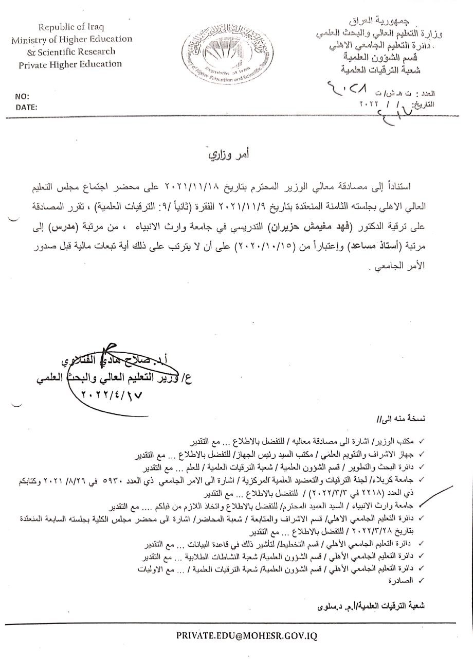 تتقدم عمادة كلية الادارة والاقتصاد واساتذتها بأزكى التهاني و التبريكات للدكتور فهد مغيمش الشمري معاون العميد للشؤون العلمية والادارية بمناسبة صدور امر وزاري بالترقيته العلمية الى ( استاذ مساعد ) متمنين له دوام النجاح و الموفقية و التقدم و العطاء في سبيل اعلاء شأن العلم في كليتنا وجامعتنا العريقة.