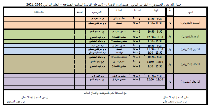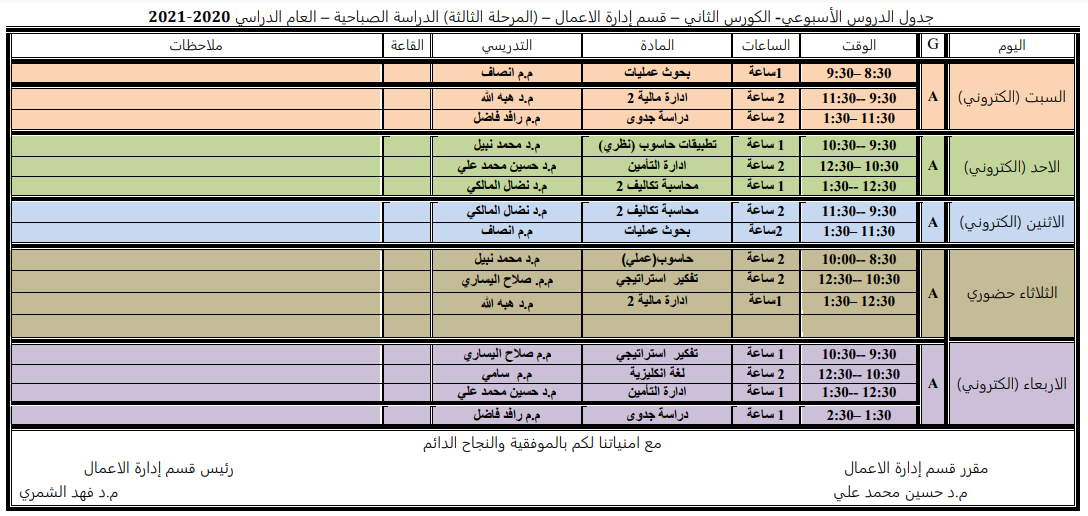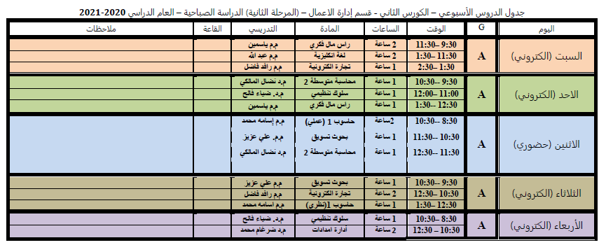 جدول الدروس الاسبوعي للكورس الثاني لقسم ادارة الاعمال الدراسة الصباحية