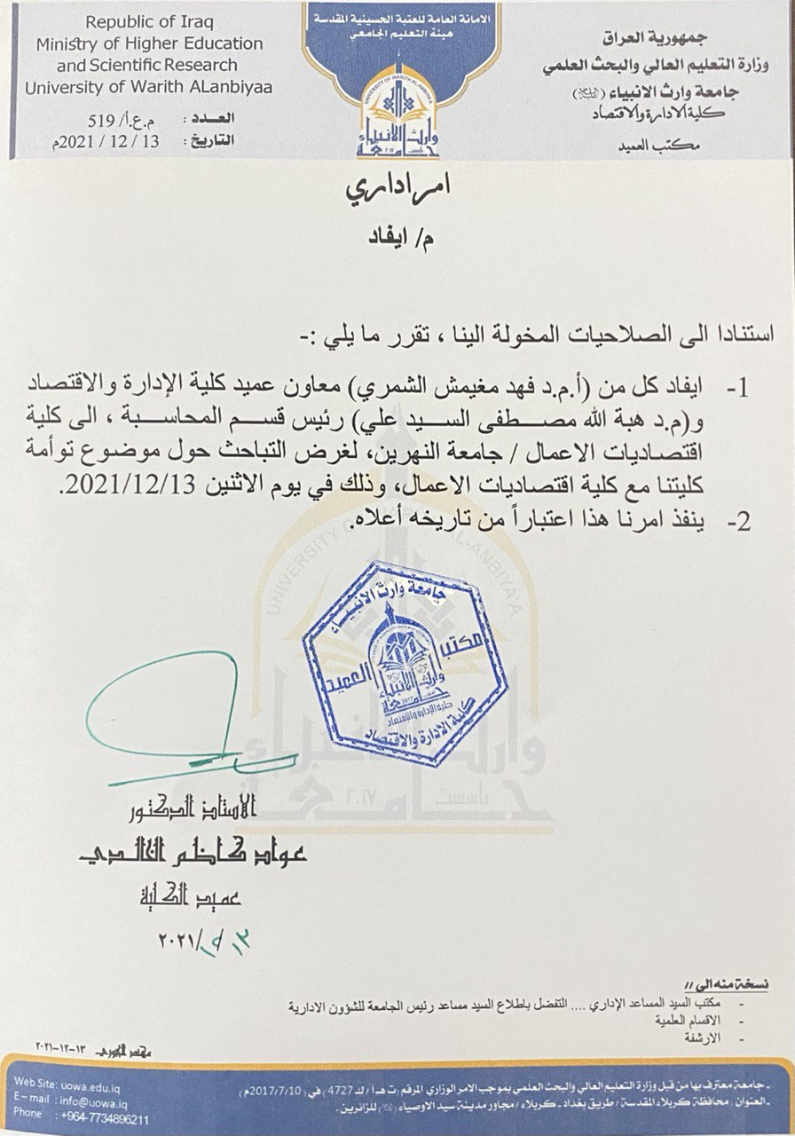 زار كل من الدكتور فهد مغيمش الشمري معاون العميد و الدكتورة هبة الله مصطفى السيد علي رئيس قسم المحاسبة في كلية الادارة والاقتصاد في جامعة وارث الأنبياء في محافظة كربلاء المقدسة ، كلية اقتصاديات الأعمال اليوم الأثنين الموافق ١٣/ ١٢/ ٢٠٢١ ، لغرض التباحث حول موضوع عقد توأمة علمية بين الكليتين. وقد تم مناقشة الفقرات الآتية :