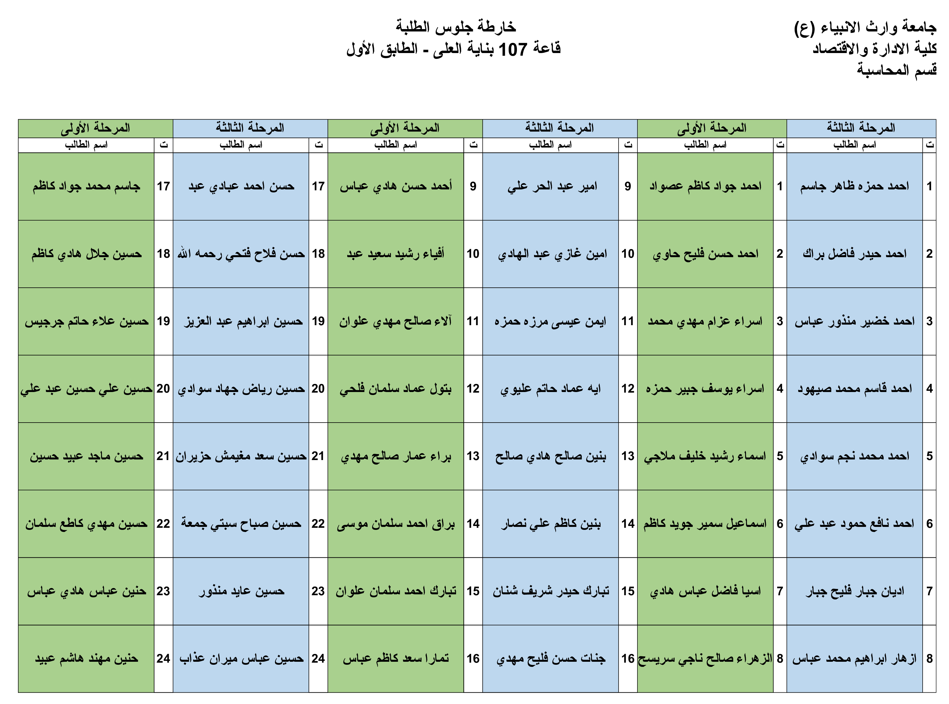 نرفق لكم خارطة الجلوس في القاعات الامتحانية لقسم المحاسبة للمرحلة الأولى والثالثة وكما موضحة في أدناه