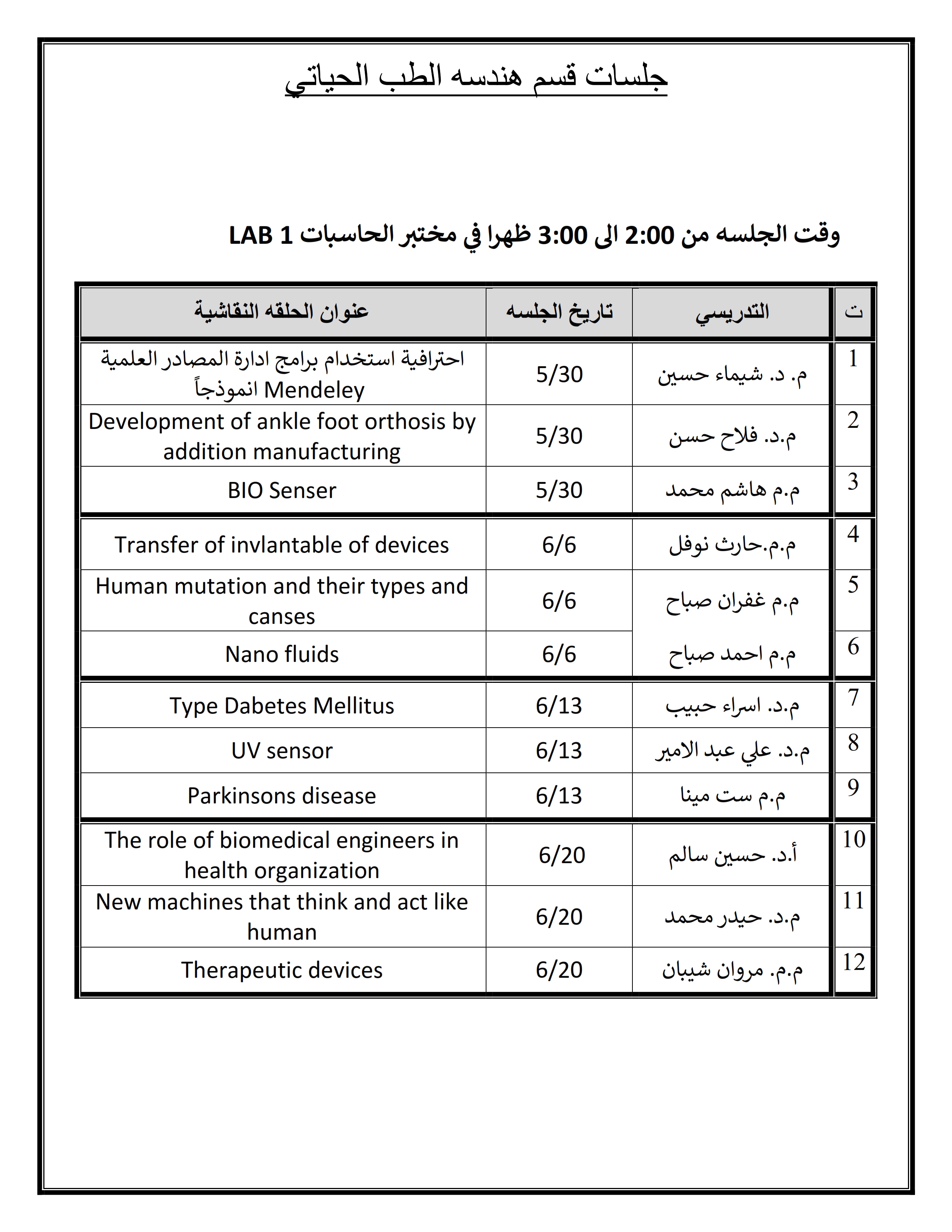 يقيم قسم هندسه الطب الحياتي بالتعاون مع قسم التعليم المستمر في جامعه وارث الأنبياء سلسلة من الحلَقات النقاشية الحضورية ابتداءاً من يوم الأحد المصادف 30/5/2021 و كما في الجدول المرفق.