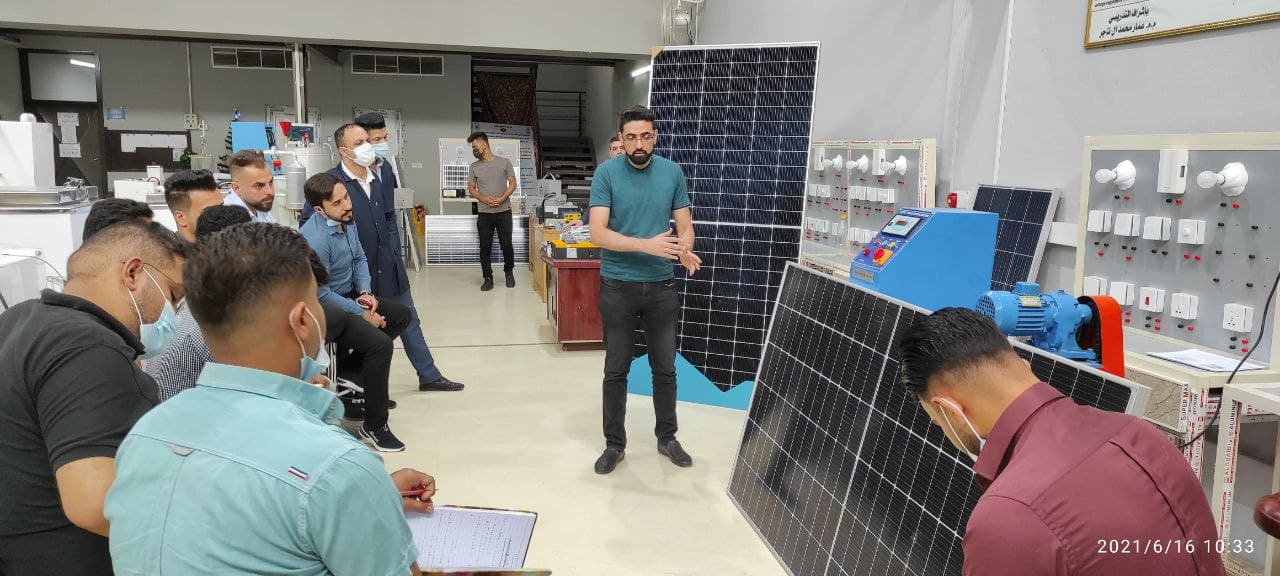 برعاية السيد المساعد العلمي لجامعة وارث الأنبياء وبأشراف مباشر من السيد عميد كُلْيَة الهندسة المحترم والسيد رئيس قسم هندسة تقنيات التكييف والتبريد أقيمت ورشة عملية في نصب منظومات شمسية وعلى مدى ثلاث أيام من قبل أساتذة قسم التكييف والتبريد وكادر شركة متخصص في هذا المجال وتستهدف هذه الورشة طلبة المرحلة الرابعة حيث يشمل البرنامَج التدريبي في اليوم الأول على التعرف على أنواع الخلايا الشمسية ومكونات المنظومات الشمسية وكيفية ربطها على التوالي والتوازي وقياس زاويه الأسقاط الشمسي وقياس كفائتها عند زوايا معينه وتأثير نسبه الظل على مقدار الفولتيه المتحققة وفي اليوم الثاني سيتدرب الطلبة على كيفية أجراء الصيانة على جهاز الانفيرتر والتعرف على طريقة عملة وكيفية استبدال القطع والعناصر التالفه فيه بوضع اخرى مشابه او مكافئة يتم استخراجها وفق جداول علمية أما اليوم الثالث سيتم تدريب الطلبة على كيفية اختيار النوع الملائم من المنظومات الشمسية لمشروع معين وكيفية تحديد معايير اختيار المنظومة المناسبة. ولله ولي التوفيق…