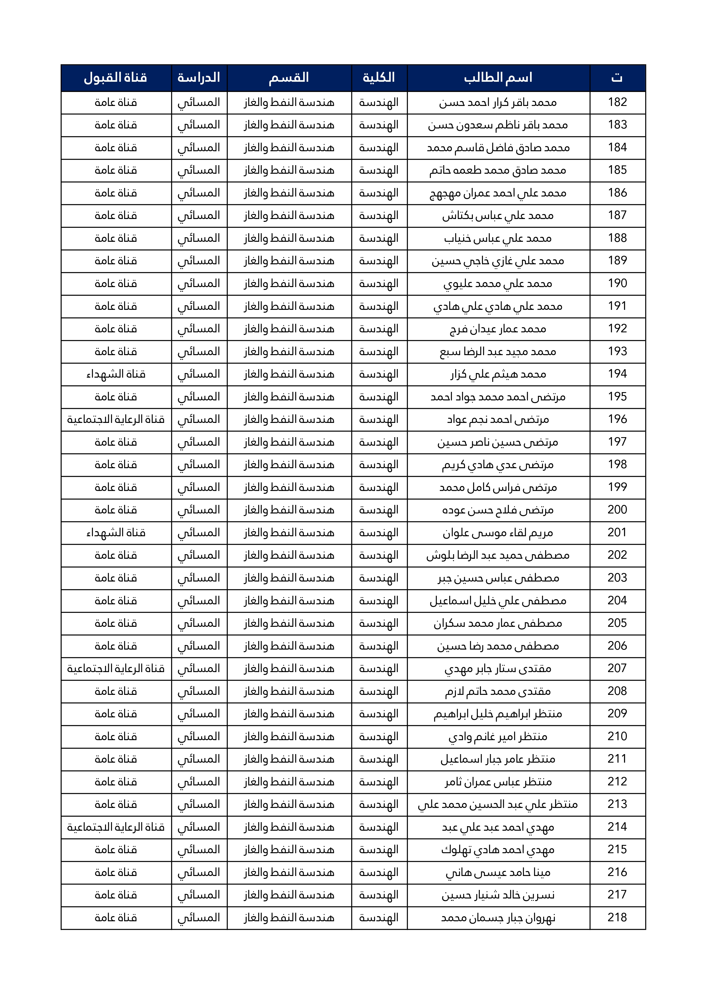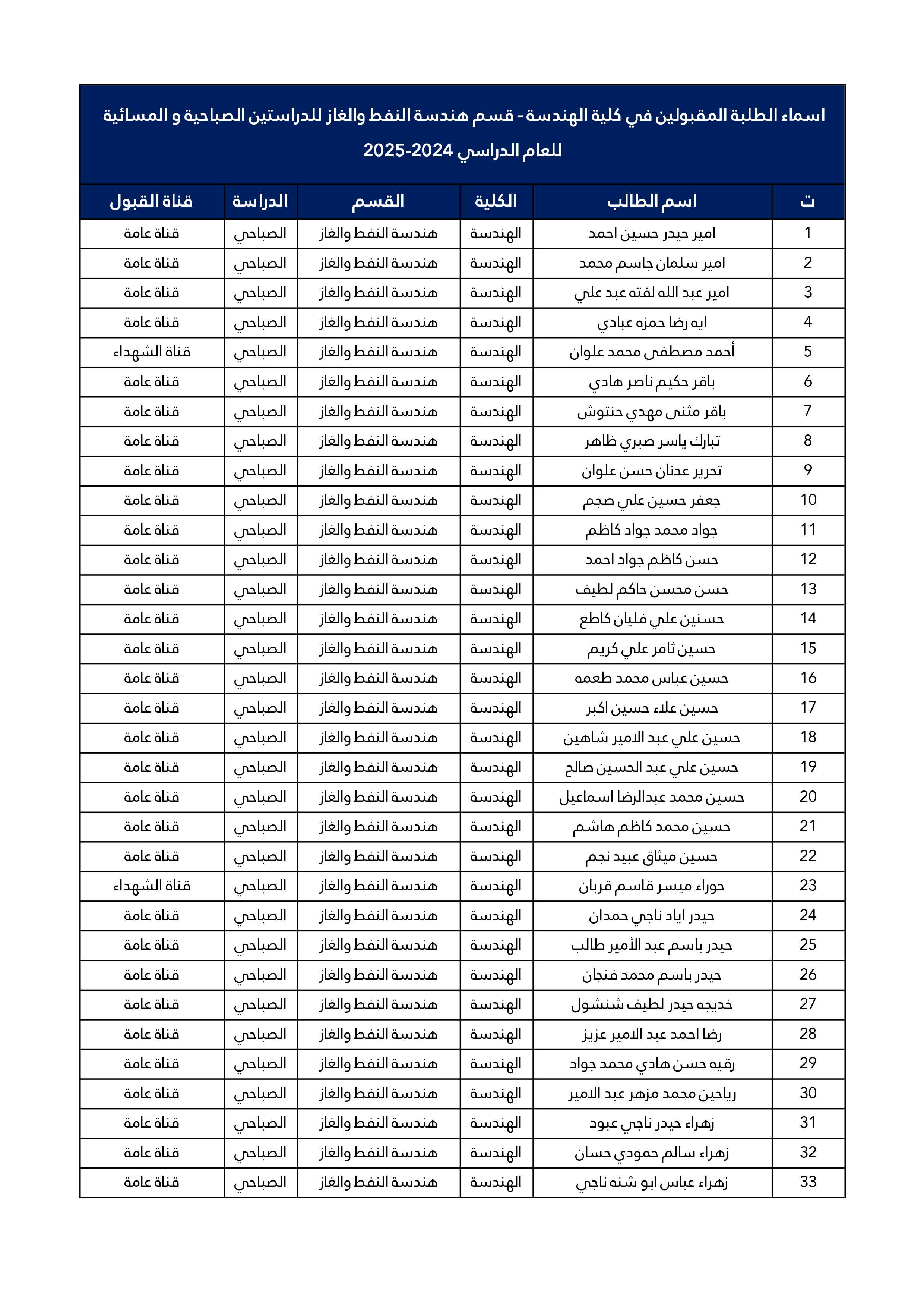 اسماء الطلبة المقبولين في قسم هندسة النفط و الغاز للعام الدراسي 2025/2024 للدراستين الصباحية و المسائية