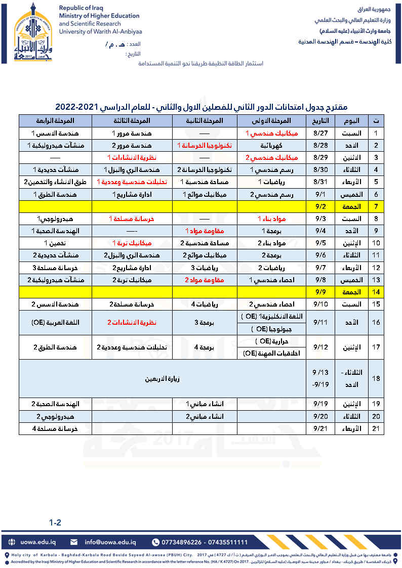 جدول امتحانات الدور الثاني لقسم الهندسة المدنية