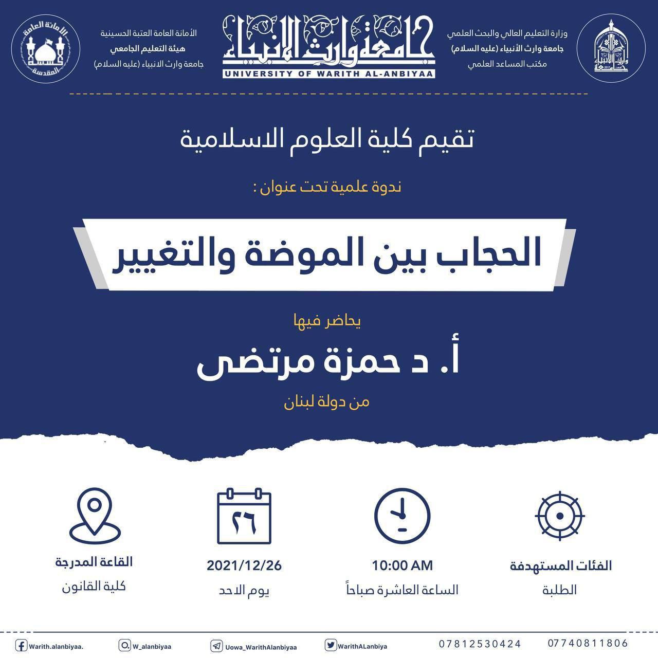 برعاية السيد رئيس الجامعة المحترم تقيم كلية العلوم الإسلامية ندوة علمية تحت عنوان (العربية : لغة القرآن الكريم وهوية امتنا) يحاضر فيها كل من الأساتذة : 1.أ.د صاحب جعفر ابو جناح ( اللغة العربية بين الواقع والتحديات ) 2.أ.د طلال خليفة العبيدي ( مستقبل اللغة العربية في عصر ما بعد الحداثة ) يوم السبت الموافق 18/12/2021 على القاعة المدرجة في كلية القانون
