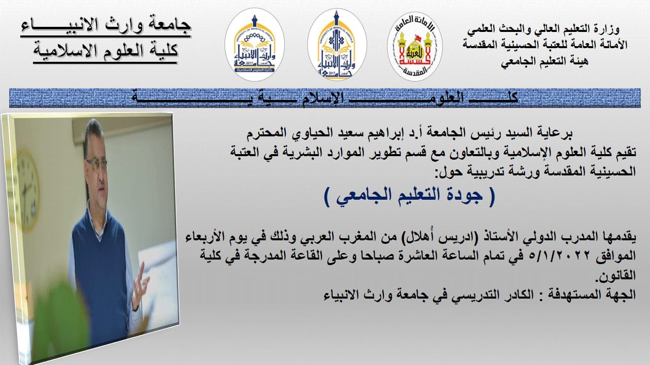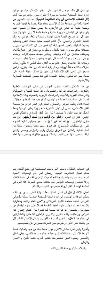 حرصا منها في ترسيخ المبادئ القيمية والأخلاقية التي أوصت بها الشريعة الإسلامية الغراء ولما لها من أثر طيب في بناء مجتمع صالح يزدهر بتراثه وثقافته الإسلامية لا سيما ترسيخ مبدأ الخطاب الإسلامي النابع من صميم الاسلام وتعاليمه رعت الأمانة العامة للعتبة الحسينية المقدسة المؤتمر الدولي السنوي الثالث والذي تقيمه كليتا العلوم الإسلامية في جامعة وارث الأنبياء وجامعة كربلاء تحت شعار الاسلام حياة وتحت عنوان اثر الخطاب الإسلامي في بناء المنظومة القيمية ووفق البرنامج المرفق والذي سيعقد في يوم السبت الموافق ٢٥/١٢/٢٠٢١