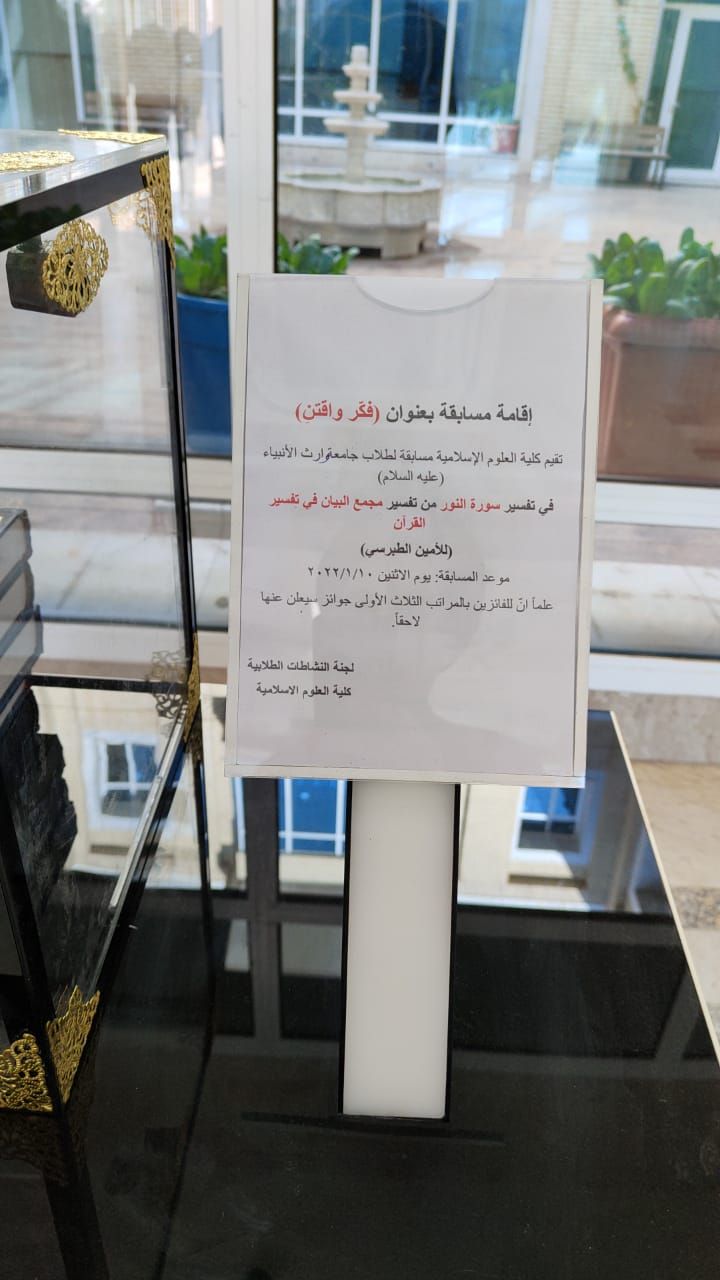 برعاية السيد رئيس الجامعة المحترم تقيم كلية العلوم الإسلامية مسابقة لحفظ والقاء مقطع من خطبة السيدة الزهراء عليها السلام وذلك في يوم السبت الموافق 8/1/2022