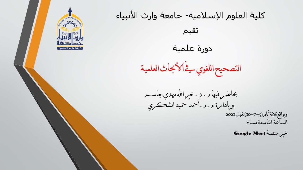تقيم كلية العلوم الإسلامية في جامعة وارث الانبياء دورة علمية تحت عنوان التصحيح اللغوي للأبحاث العلمية وبواقع ثلاثة أيام يحاضر فيها م.د خير الله مهدي جاسم ويمكنكم المشاركة عبر الرابط أدناه