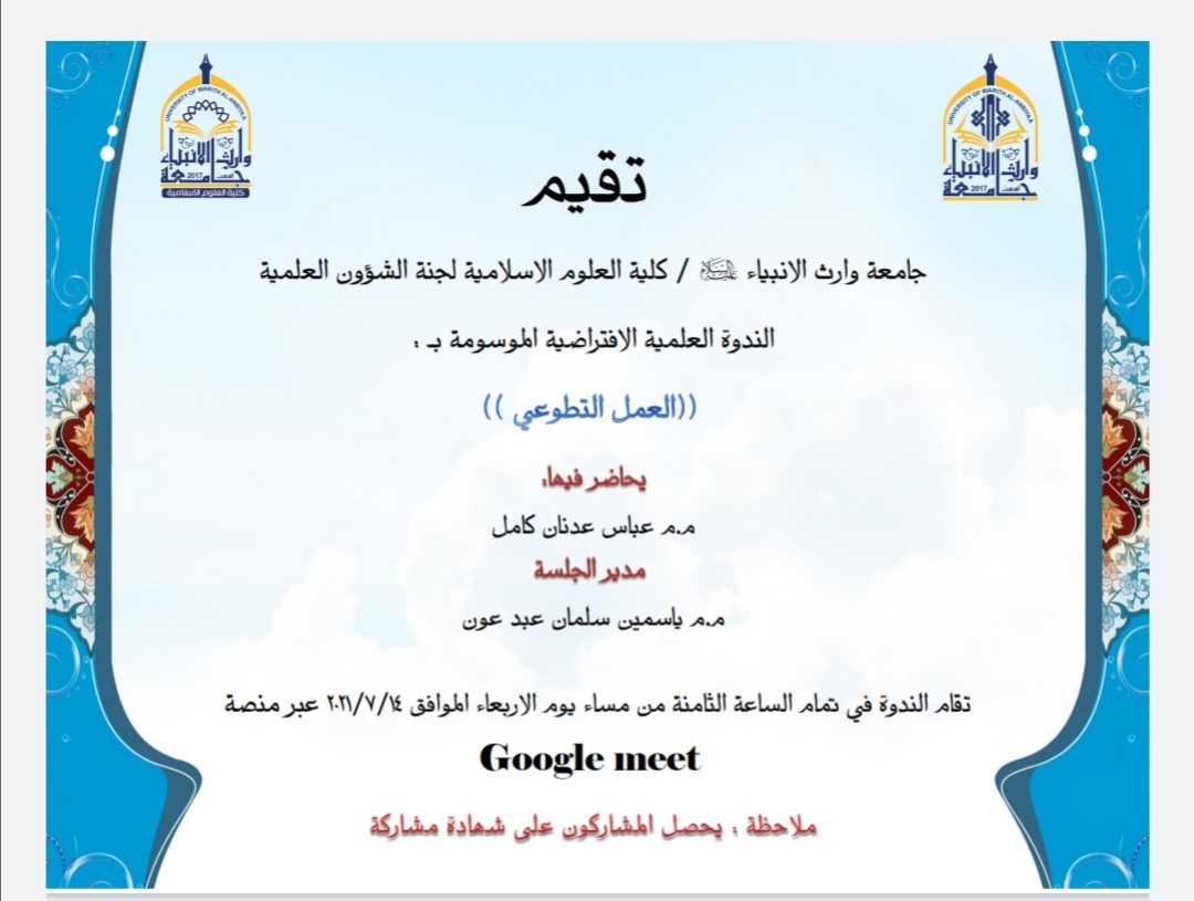 حلقة نقاشية بعنوان : العمل التطوعي يحاضر فيها م. م عباس عدنان كامل وبادارة م. م ياسمين سلمان الطرفي في يوم الأربعاء الموافق ١٤ / ٧ / ٢٠٢١ في تمام الساعة الثامنة والنصف مساءً عبر منصة التعليم الإلكتروني الكوكل ميت