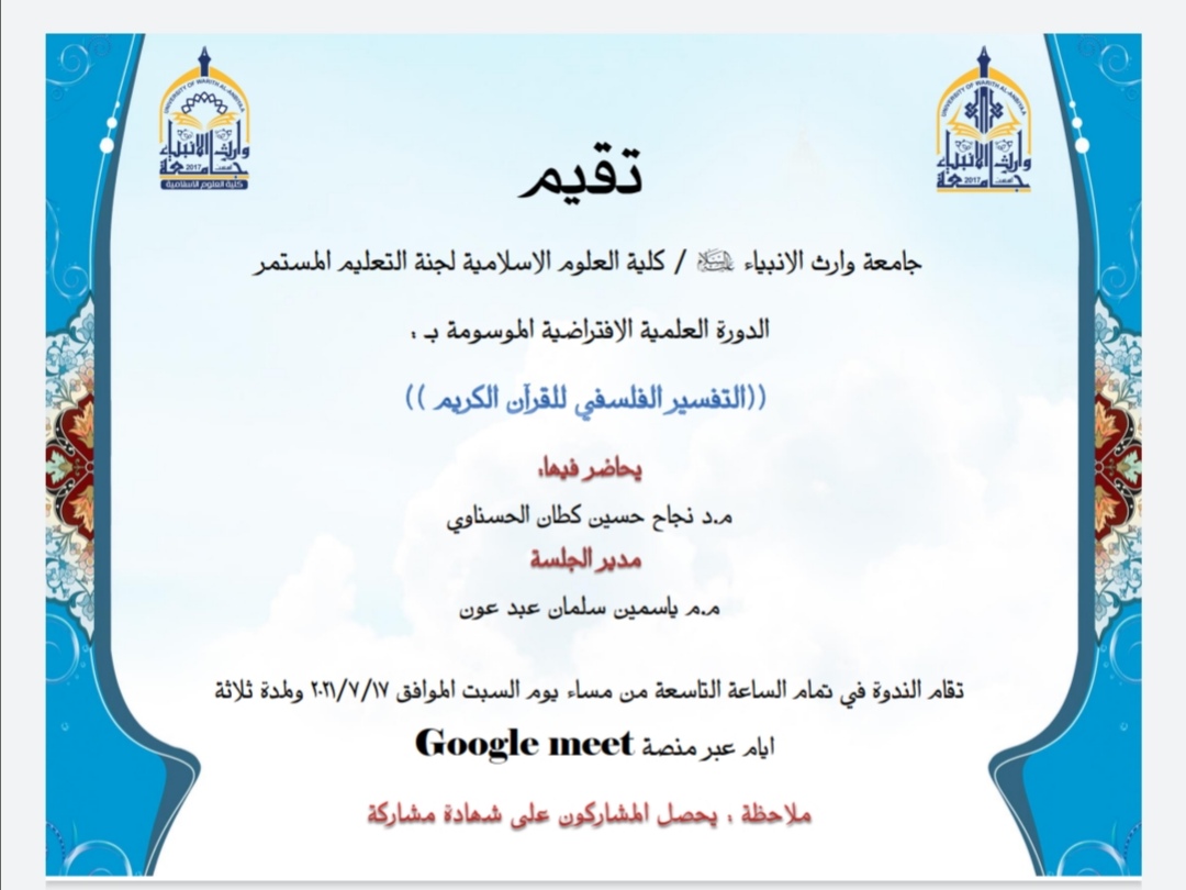 2021/07/14حلقة نقاشية بعنوان ( الصفات الصوتية معيارا دلاليا عند المتصوفة) يحاضر فيها الدكتور علاء صالح عبيد ويديرها الدكتور حكيم السلطاني في يوم الثلاثاء الموافق ١٣ / ٧ / ٢٠٢١ في تمام الساعة الثامنة والنصف مساءً عبر منصة التعليم الإلكتروني الكوكل ميت
