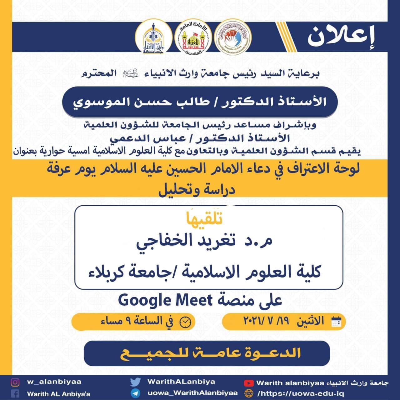 تقيم كلية العلوم الإسلامية في جامعة وارث الانبياء حلقة نقاشية تحت عنوان خصوصية مواقع التواصل الاجتماعي يحاضر فيها م.م علي كريم المجاب وذلك في يوم الخميس الموافق 15/7/2021 وذلك في تمام الساعه الثامنه والنصف مساء وعبر المنصة الإلكترونية الكوكل ميت