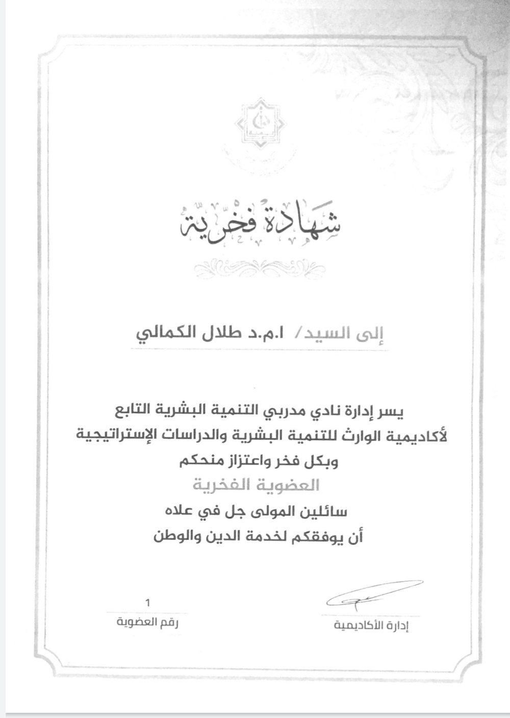 حصل السيد عميد كلية العلوم الإسلامية أ.م.د طلال الكمالي المحترم على العضوية الفخرية الاولى  في نادي المدربين التابع لاكاديمية الوارث للتنمية البشرية والدراسات الاستراتيجية في العتبة الحسينية المقدسة...