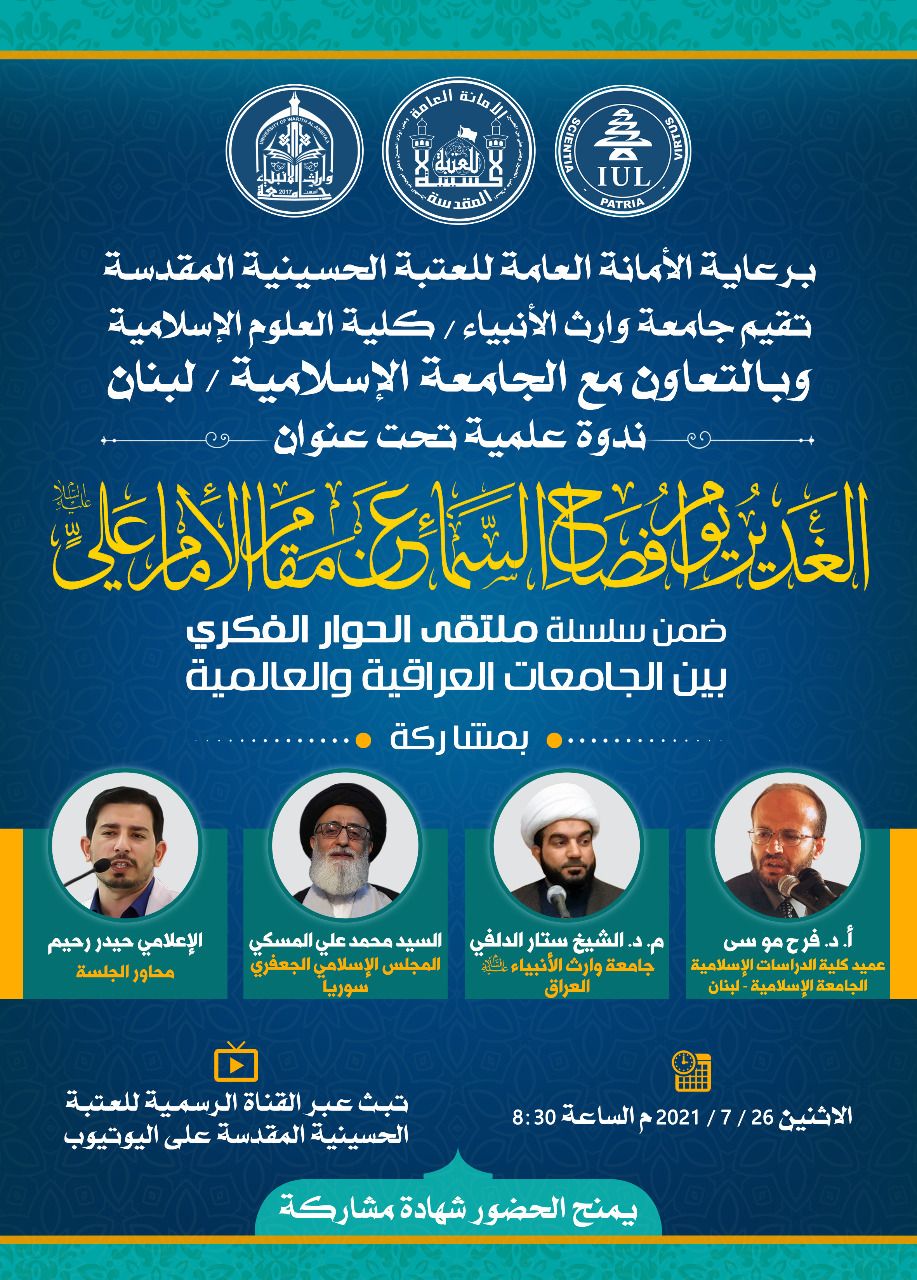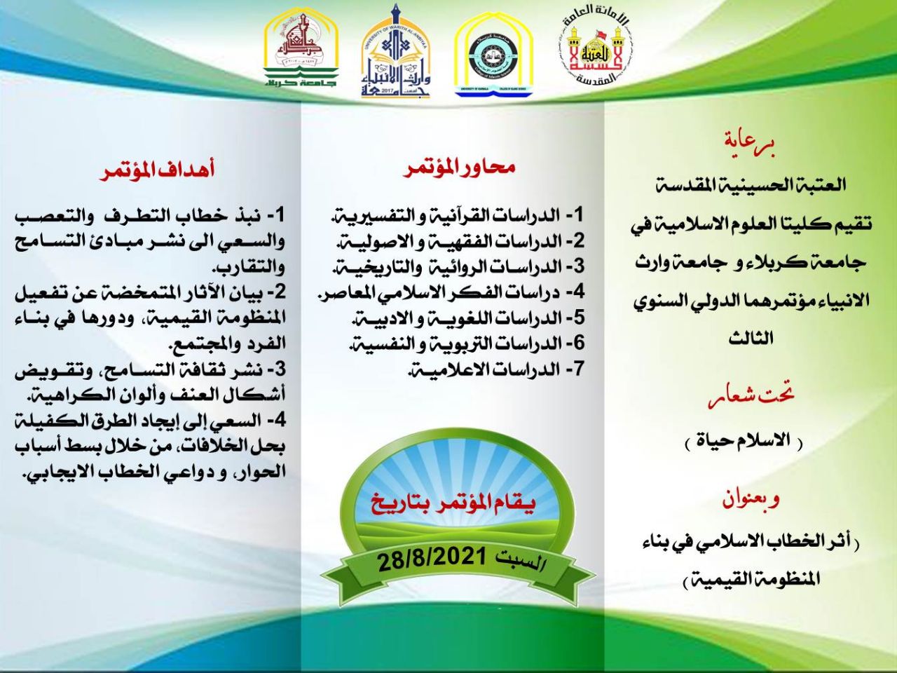 تقيم كلية العلوم الإسلامية في جامعة وارث الانبياء التابعة للعتبة الحسينية المقدسة مؤتمرها العلمي تحت شعار الإسلام حياة والموسوم ب( اثر الخطاب الاسلامي  في بناء  المنظومة القيمية )