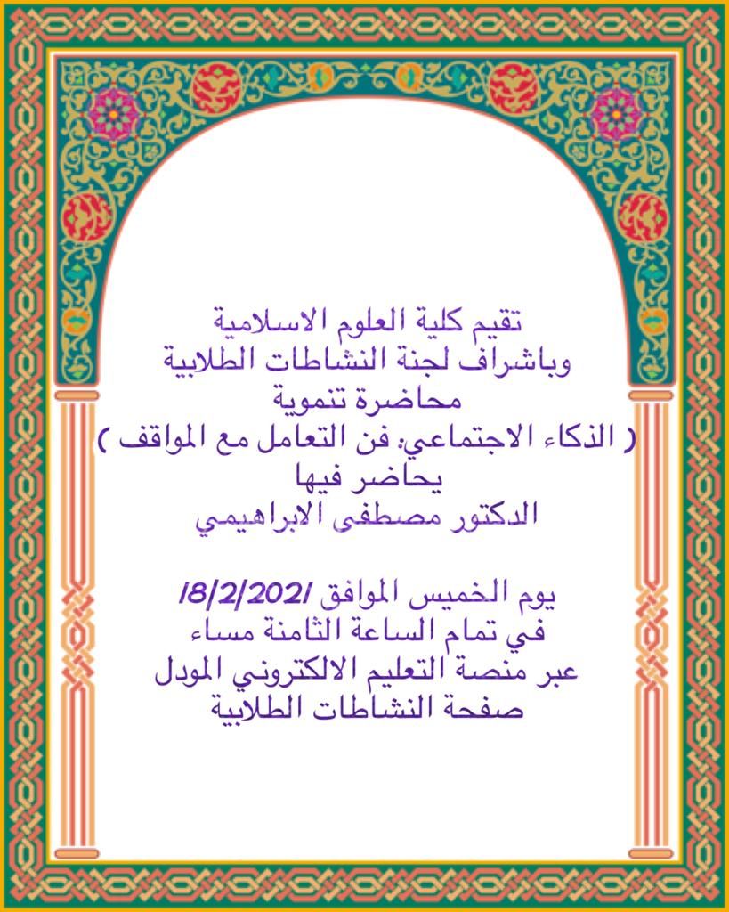 محاضرة تنموية علمية يحاضر فيها الدكتور ( مصطفى جعفر الإبراهيمي) بعنوان ( الذكاء الاجتماعي فن التعامل في المواقف). وذلك في يوم الخميس الموافق ١٨ / ٢ /٢٠٢١ في تمام الساعة الثامنة مساء على منصة التعليم الإلكتروني (المودل)