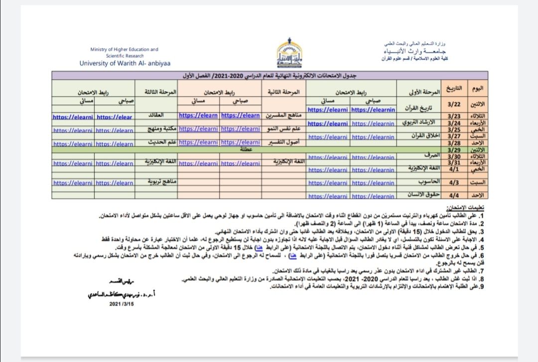 جدول الامتحانات النهائية الحضورية لقسم علوم القرآن للفصل الاول