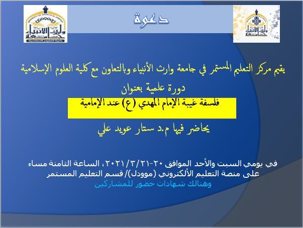 يقيم مركز التعليم المستمر في جامعة وارث الأنبياء وبالتعاون مع كلية العلوم الإسلامية دورة علمية بعنوان ( فلسفة غيبة الإمام المهدي (ع) عند الامامية) يحاضر فيها الدكتور ( ستار عويد الدلفي) في يومي السبت والأحد ٢٠ _ ٢١ / ٣ / ٢٠٢١ في تمام الساعة الثامنة مساء على منصة التعليم الإلكتروني المودل / قسم التعليم المستمر
