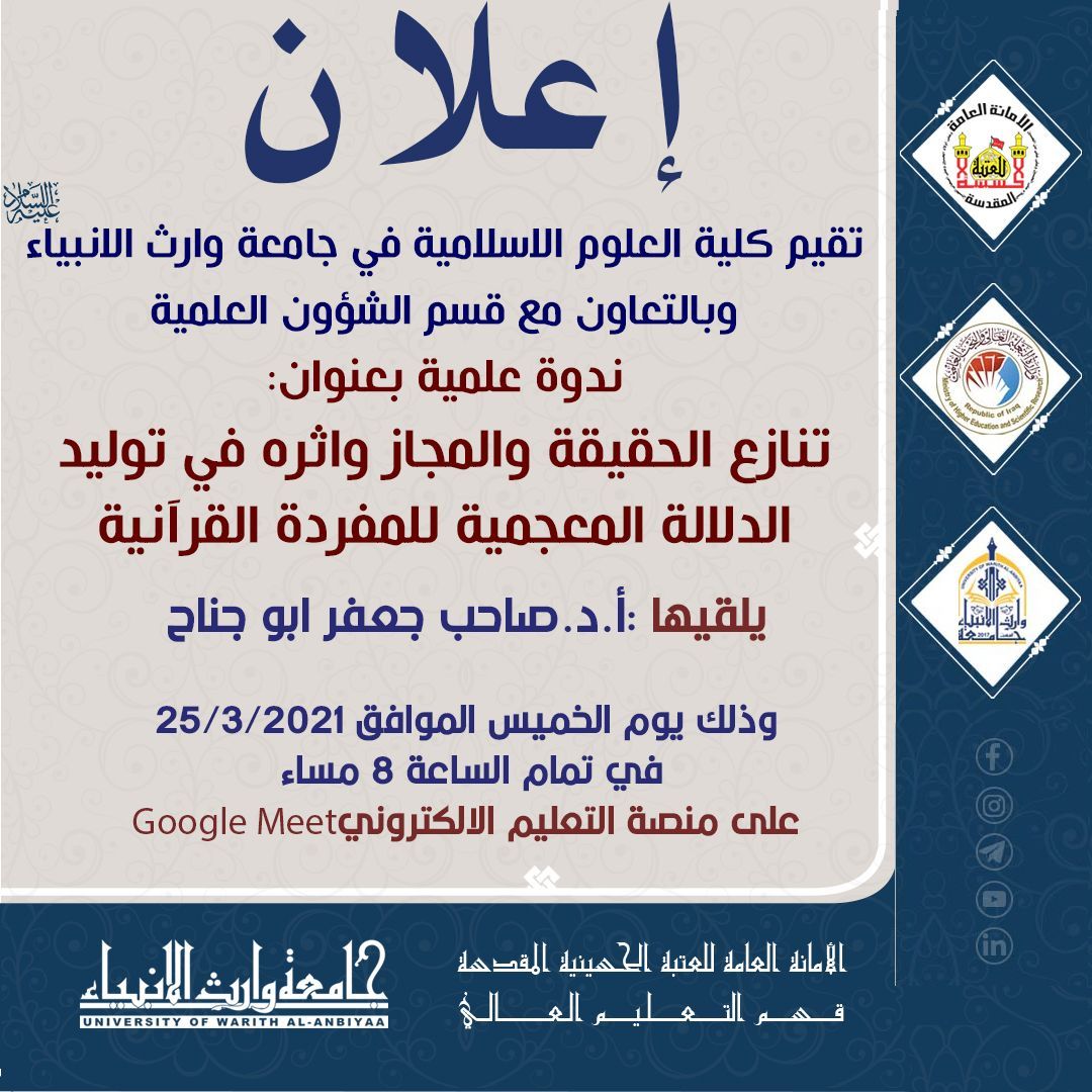 تقيم كلية العلوم الإسلامية وبالتعاون مع قسم الشؤون العلمية ندوة علمية بعنوان ( تنازع الحقيقة والمجاز وأثره في توليد الدلالة المعجمية للمفردة القرآنية) يلقيها ( ا. د صاحب جعفر ابو جناح) وذلك في يوم الخميس الموافق ٢٥ / ٣ / ٢٠٢١ في تمام الساعة الثامنة مساء على منصة التعليم الإلكتروني Google Meet