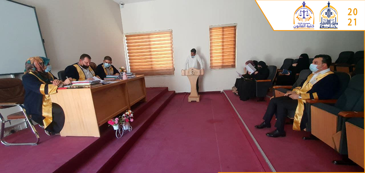 أنهت كلية القانون بتاريخ 2021/6/30 مناقشة بحوث التخرج التي جرت في قاعات الكلية من تاريخ 26/6/2021 بحضور السيد عميد الكلية أ.م.د عدنان هاشم جواد والسيد رئيس القسم أ.م.د علي صاحب جاسم .