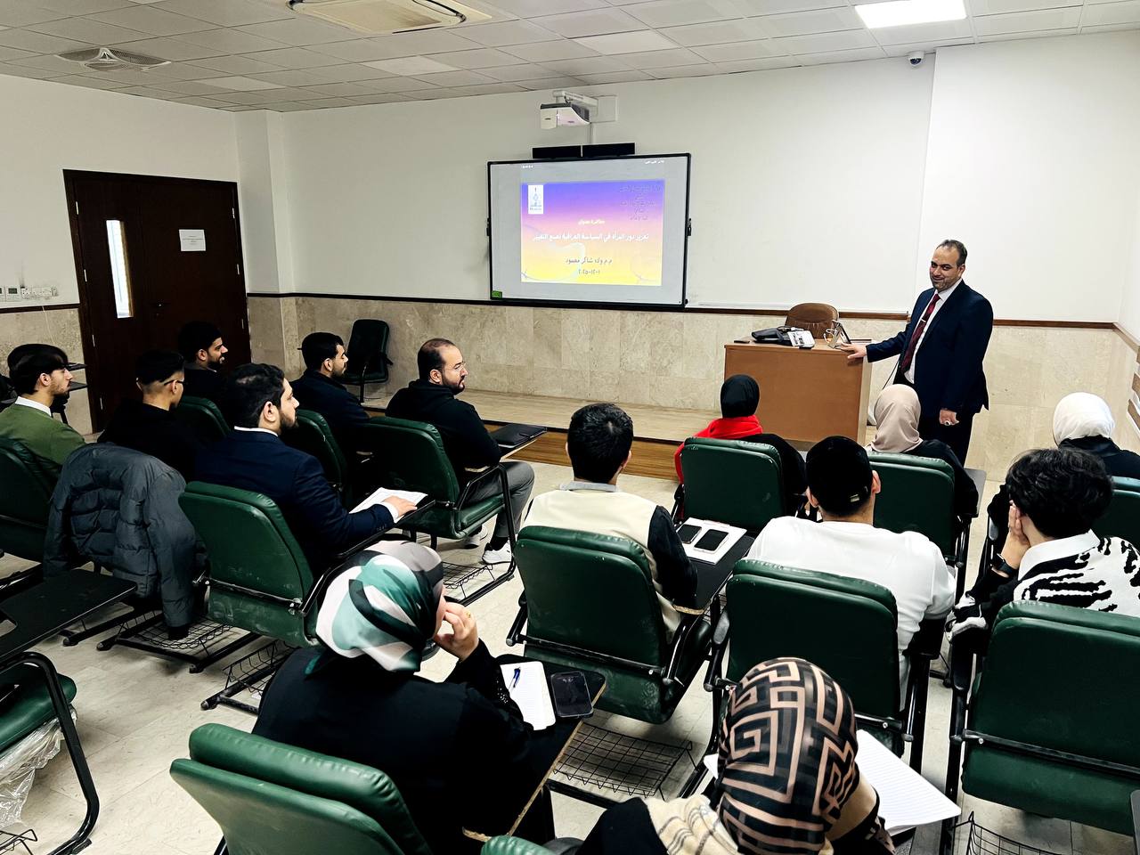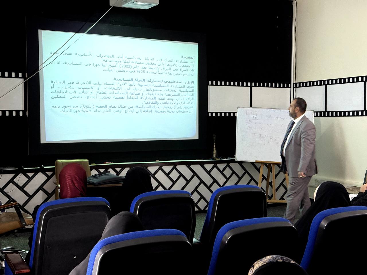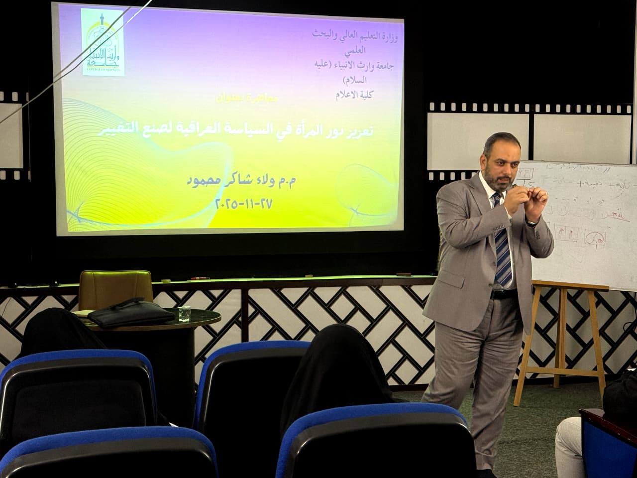 اقامت كلية الاعلام في جامعة وارث الانبياء عليه السلام، ندوة علمية حملت عنوان "تعزيز دور المرأة في السياسة العراقية لصنع التغيير" قدمها التدريسي في الكلية الاستاذ (ولاء شاكر محمود)، بين من خلالها ان المشاركة السياسية النسوية يعنى بها قدرة النساء على الانخراط في العملية السياسية بمختلف مستوياتها، سواء في الانتخابات، أو الانتساب للأحزاب، أو المناصب التشريعية والتنفيذية، أو صياغة السياسات العامة، أو التأثير في اتجاهات الرأي العام، وهي تمثل امتداداً لعملية تمكين أوسع، تشمل التمكين الاقتصادي والاجتماعي والثقافي.