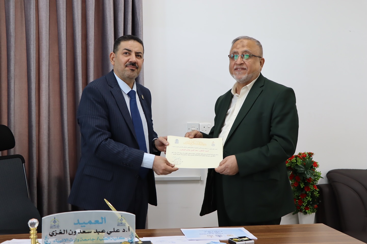 وفي ختام الاجتماع قدّم عميد الكلية الأستاذ الدكتور علي عبد سعدون الغزي كتب شكر وتقدير لممثلي مجلس أعيان كربلاء تقديراً لمشاركتهم الفاعلة ومساهمتهم في دعم مسيرة التطوير الأكاديمي والطبي في الجامعة