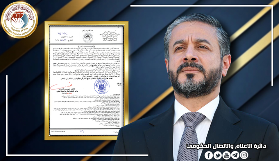 حرصا على إتاحة الفرصة أمام الراغبين بالالتحاق ببرامج الدراسات العليا واستكمال متطلبات التقديم في ضوء المناشدات التي وردت بهذا الخصوص وجه وزير التعليم العالي والبحث العلمي الدكتور نعيم العبودي بتأجيل موعد التقديم إلى الدراسات العليا إلى الخميس الموافق 15 آيار 2025.