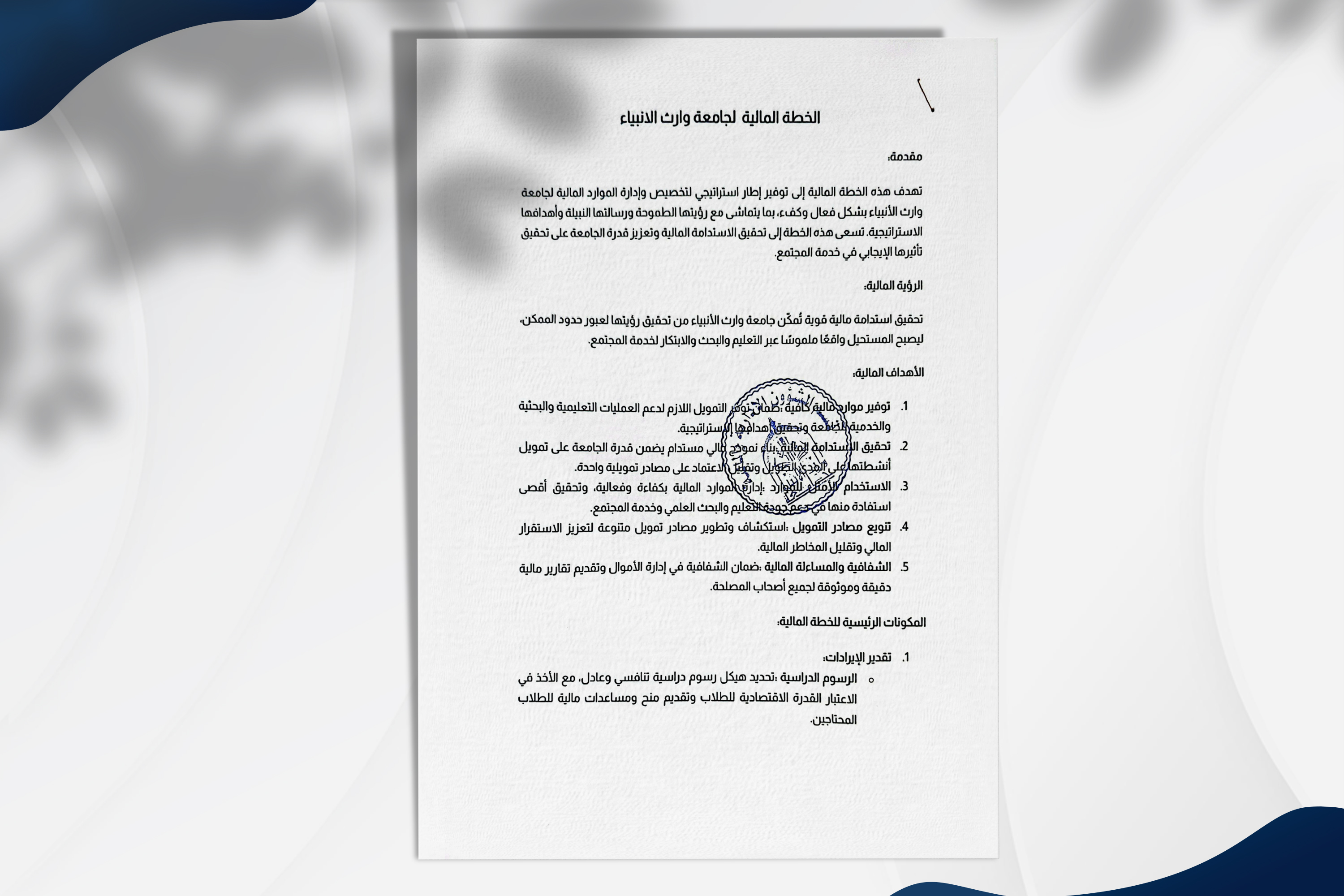 أطلقت جامعة وارث الأنبياء (عليه السلام) خطتها المالية الجديدة التي تهدف إلى تعزيز الاستدامة المالية وتنمية الموارد، بما يسهم في تحقيق رؤيتها في خدمة المجتمع والارتقاء بجودة التعليم العالي.