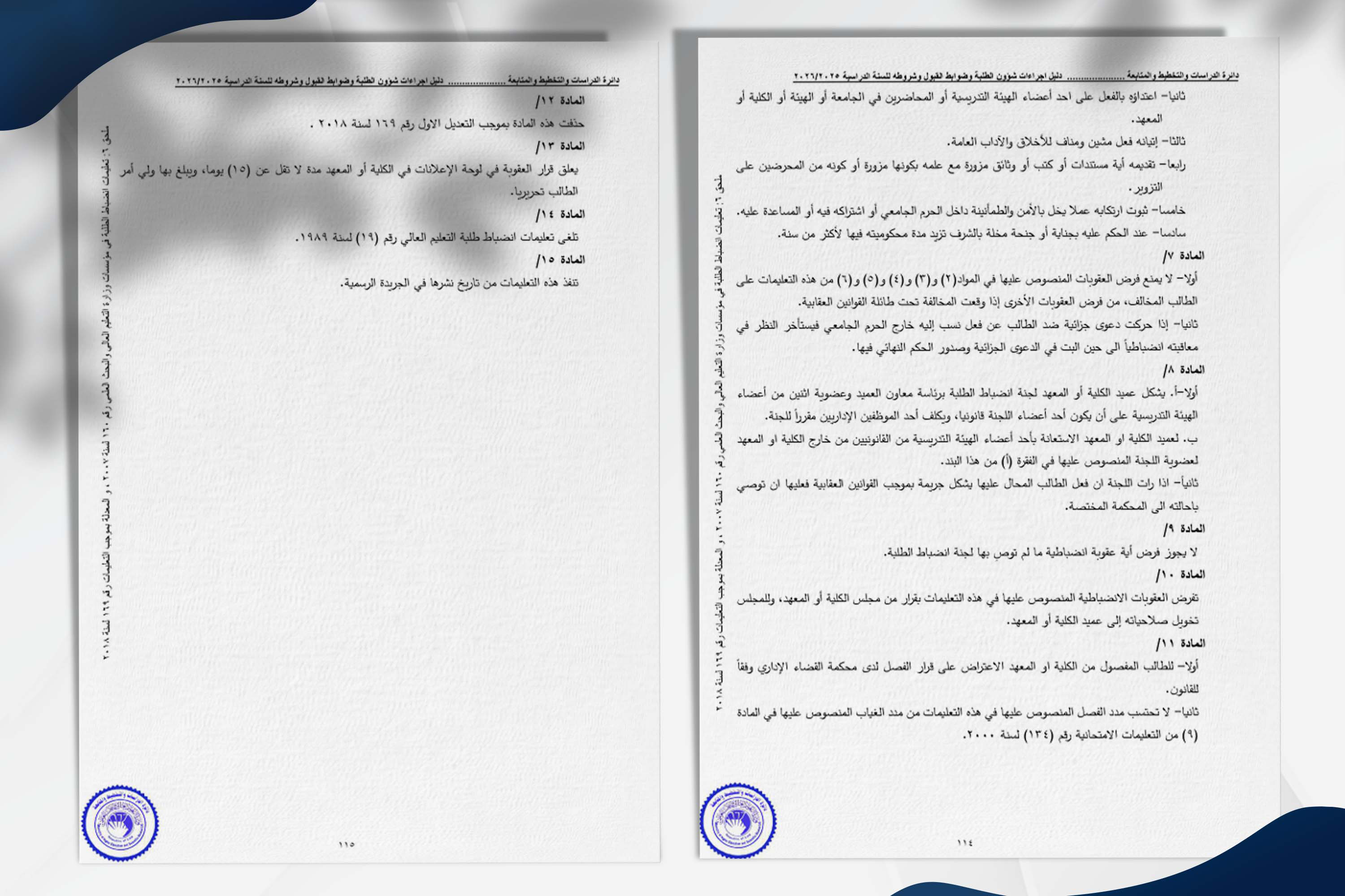 تحرص جامعتنا على تتويج مسيرتكم العلمية بقيم الانضباط والالتزام، التي تعدّ حجر الأساس لتسهيل الإجراءات الإدارية ، إلى جانب تعزيز بيئة تعليمية مثالية. وفي هذا السياق، ندعوكم إلى الالتزام بمجموعة من التعليمات التي تهدف إلى دعم مسيرتكم الأكاديمية وتحقيق تطلعاتكم.