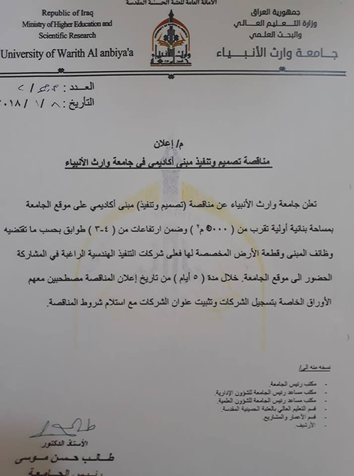 تم تمديد موعد نهاية تستليم شروط المناقصة الى يوم الاثنين الموافق ٢٢/١/٢٠١٨ لاتاحة الفرصة بشكل اكبر لشركات المقاولات ..