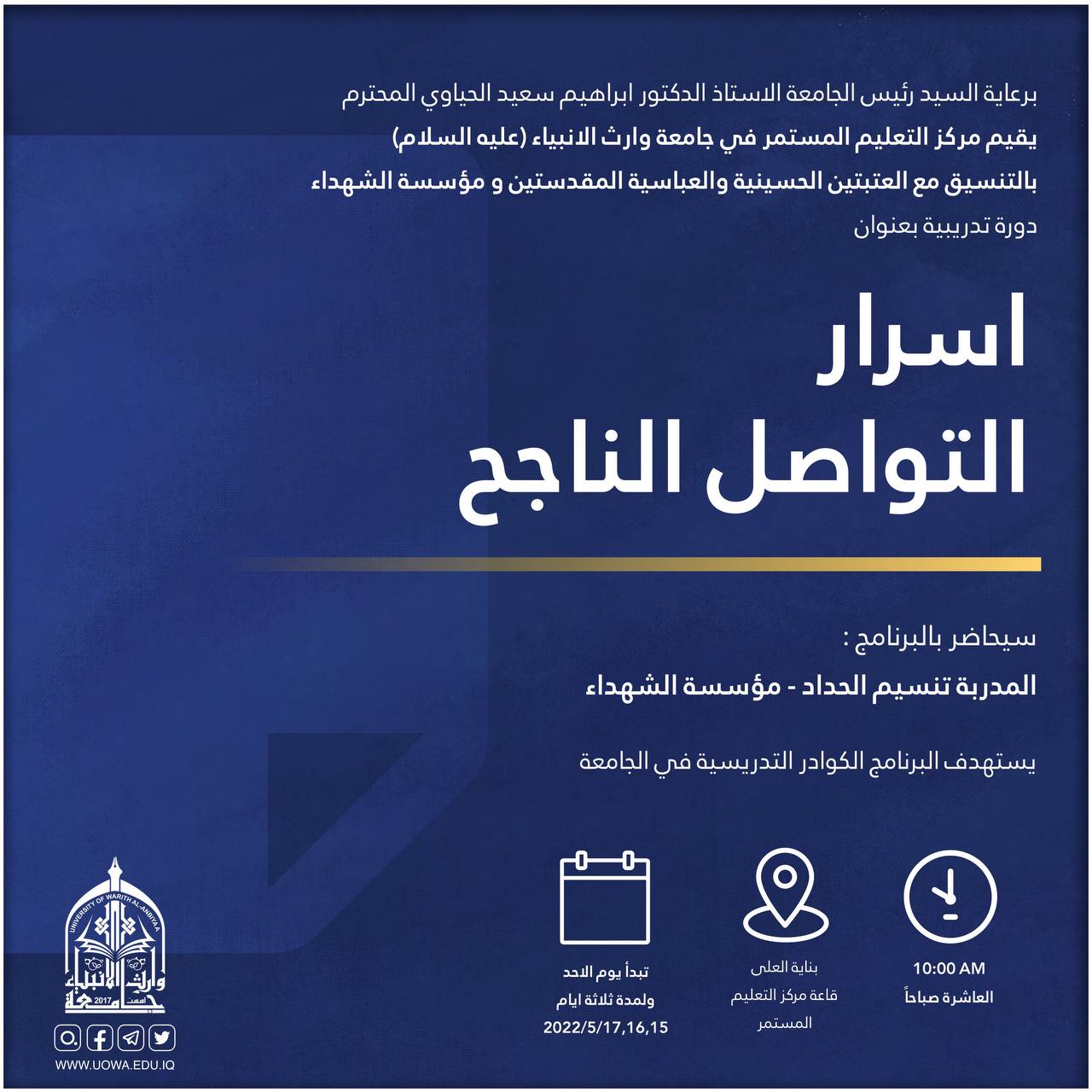 برعاية السيد رئيس الجامعة المحترم يقيم قسم التعليم المستمر بالتعاون مع كلية العلوم الإسلامية في جامعة وارث الانبياء دورة تدريبية حول شروط وضوابط الترقيات العلمية تقدمها أ.م.د. نور مهدي الساعدي