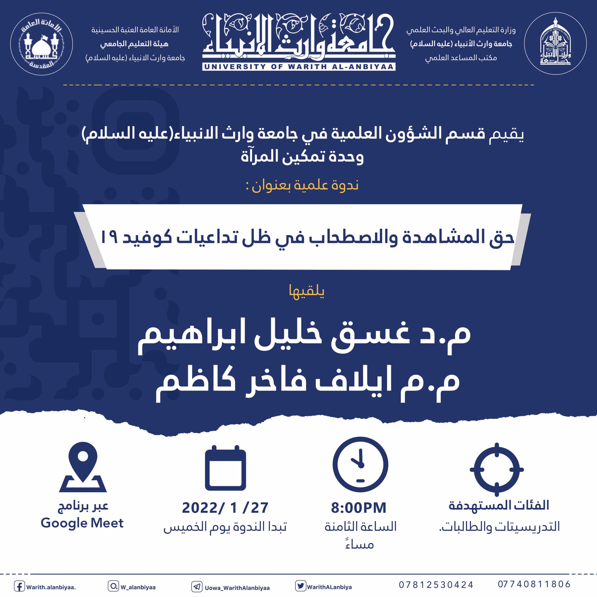 اختتم قسم الشؤون العلمية وبالتعاون مع وحدة تمكين المرأة في جامعة وارث الأنبياء (عليه السلام)، ندوة علمية افتراضية بعنوان " حق المشاهدة والاصطحاب في ظل تداعيات كوفيد 19"، التي القتها كل من م.د غسق خليل ابراهيم وم.م ايلاف فاخر كاظم عبر برنامج Google Meet، وذلك يوم الخميس الموافق 27-1-2022.