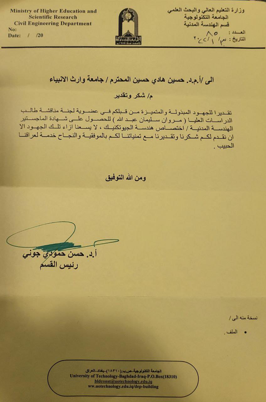 نظرا لماتمتلكه جامعة وارث الانبياء(عليه السلام) من طاقات أكاديمية متميزة، اختير الأستاذ المساعد الدكتور حسين هادي معاون عميد كلية الهندسة عضواً لمناقشة رسالة ماجستير لاحد طلبة الدراسات العليا في كلية الهندسة/ قسم الهندسة المدنية بالجامعة التكنلوجية.ومن جانبها قدمت رئاسة القسم المدني في الجامعة التكنلوجية كتاب شكر وتقدير للدكتور حسين هادي تثميناً لجهوده وسعيه في دعم العملية التعليمة من خلال المشاركة في مناقشة رسائل طلبة الدراسات العليا.